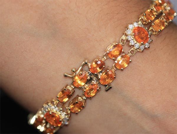 14K YELLOW GOLD MANDARINE GARNET AND DIAMOND BRACELET **|**|** 14K YELLOW GOLD MANDARINE GARNET AND DIAMOND BRACELET; MANDARINE GARNET WEIGHT 26.00 CTW; DIAMOND WEIGHT 1.65 CTW; GOLD WEIGHT AND DESCRIPTION 14K YELLOW/ 17.00 GRAMS ; MSRP: $0