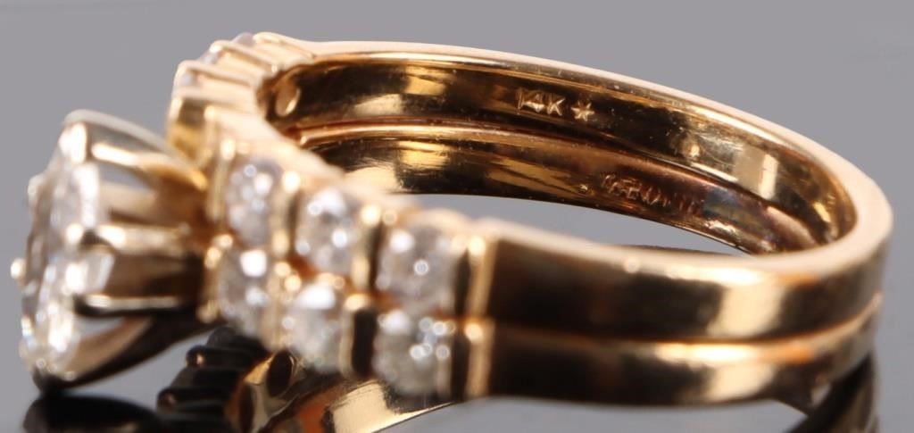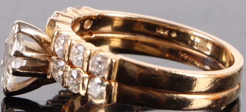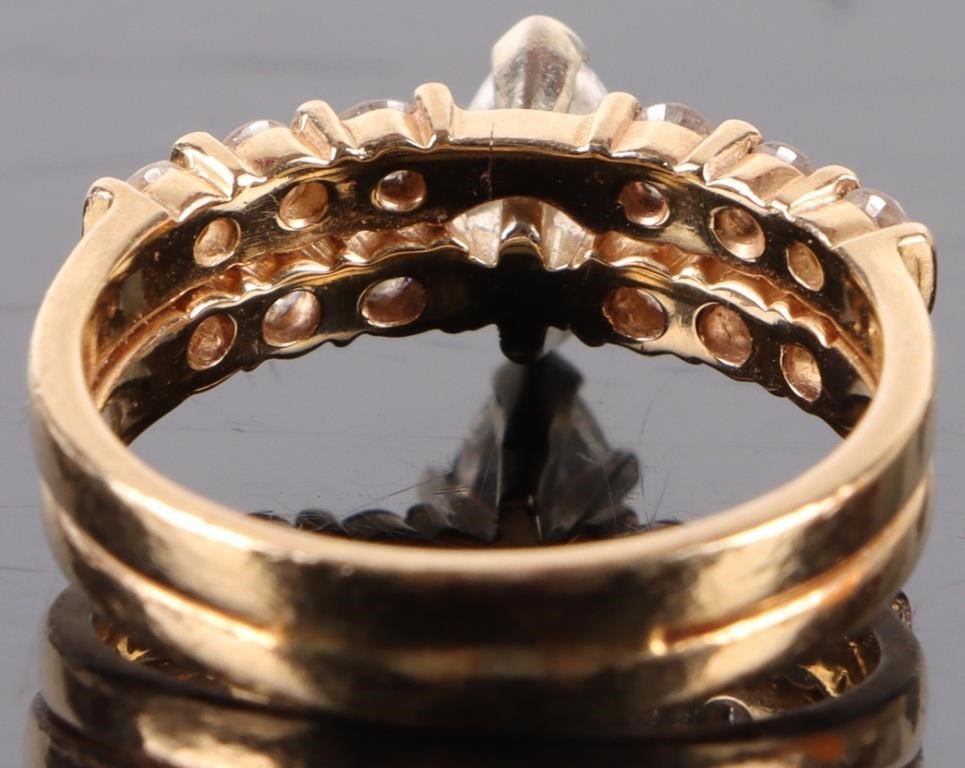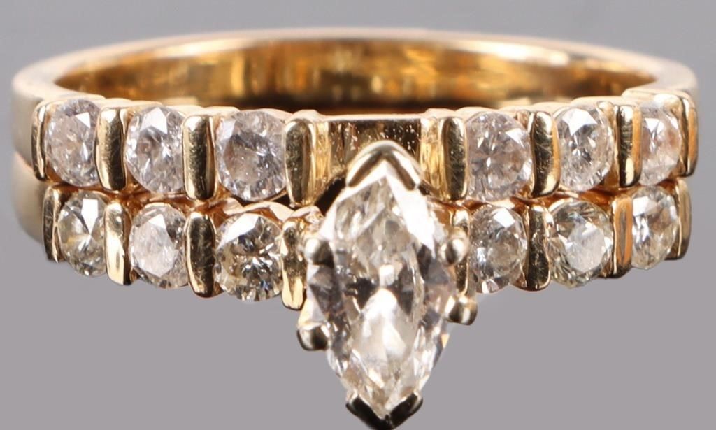 14k yellow gold marquise diamond ladies ring with one 0.40ct marquise diamond and twelve 0.05ct round diamonds.