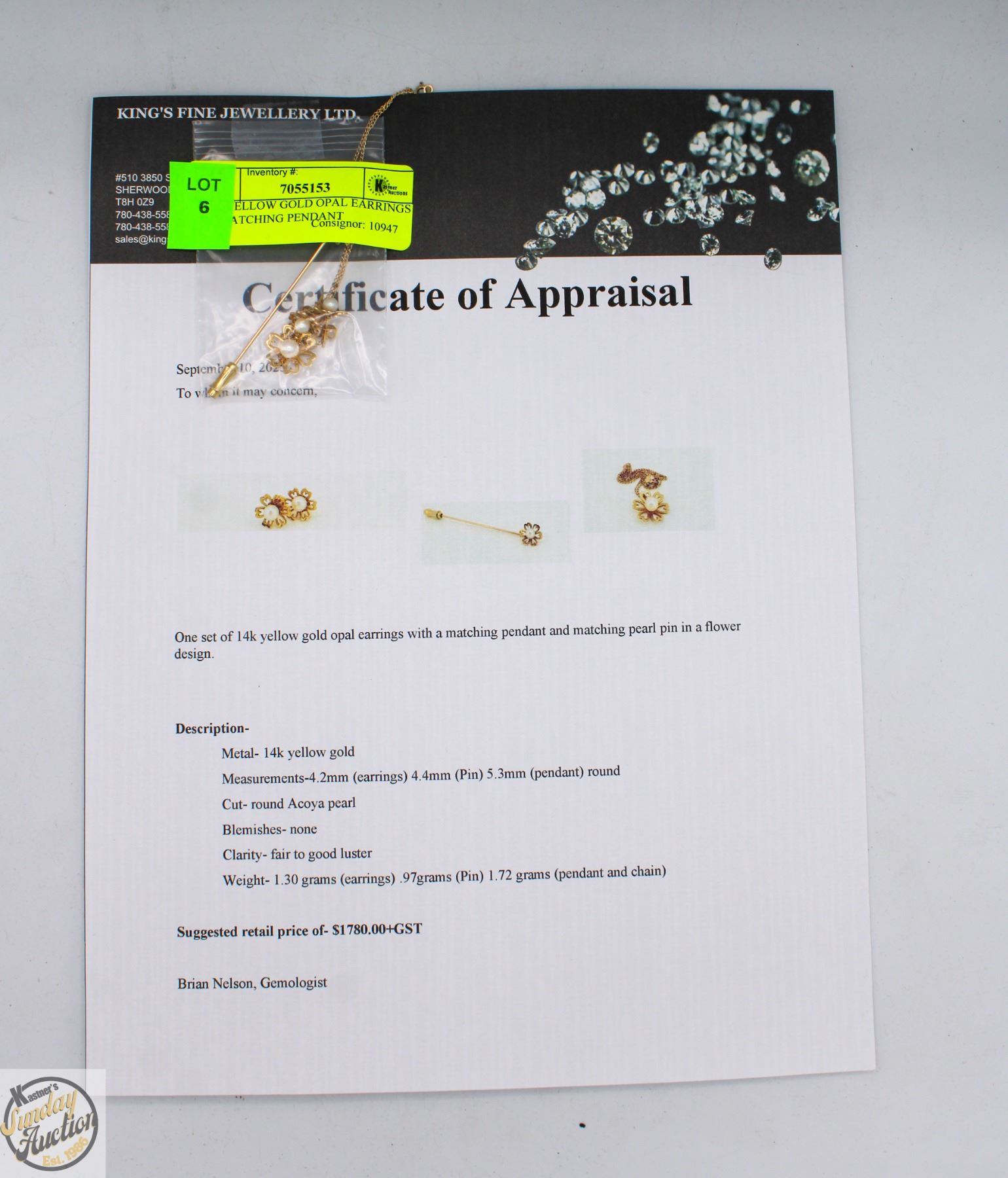 AND MATCHING PEARL PIN IN A FLOWER DESIGN. MEASURING 4.2MM (EARRINGS) 4.4MM (PIN) AND 5.3MM (PENDANT), ACOYA ROUND CUT PEARLS, NO BLEMISHES, FAIR TO GOOD LUSTER, WEIGHTING 1.3G (EARRINGS) .97G (PIN) AND 1.72G (PENDANT AND CHAIN). COMES WITH APPRAISAL, VALUED AT $1,780.00 **ALL ITEMS MUST BE REMOVED BY 5PM SATURDAY, NOVEMBER 29TH 2025. ALL REMAINING ITEMS WILL BE SUBJECT TO A $6.00 PER DAY STORAGE CHARGE. ANY ITEMS REMAINING AFTER MONDAY, DECEMBER 15TH 2025 WILL BE CONSIDERED FORFEITED. NO REFUNDS WILL BE ISSUED FOR FORFEITED ITEMS. TO SCHEDULE A PICK UP APPOINTMENT CLICK HERE