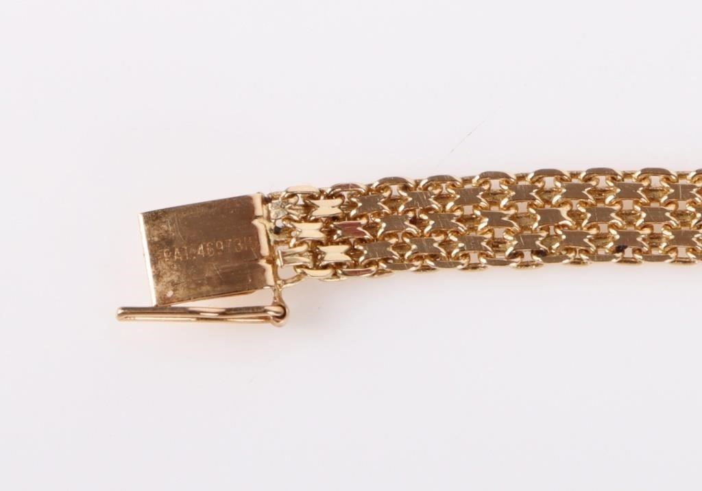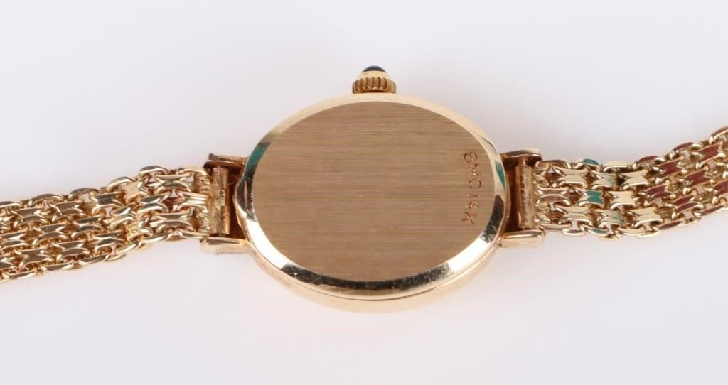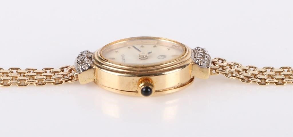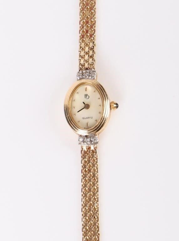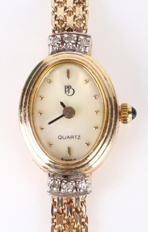 14K yellow gold PB quartz diamond ladies watch with six 0.01ct round diamonds. Bracelet is also 14K gold.