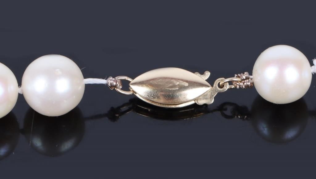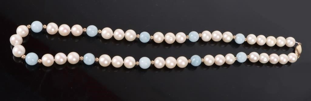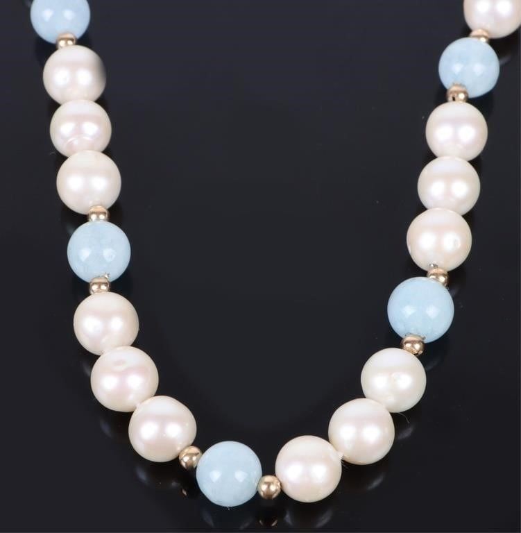 14K yellow gold clasp with fold bead accents. Natural Pearl necklace strand with blue jade beads.