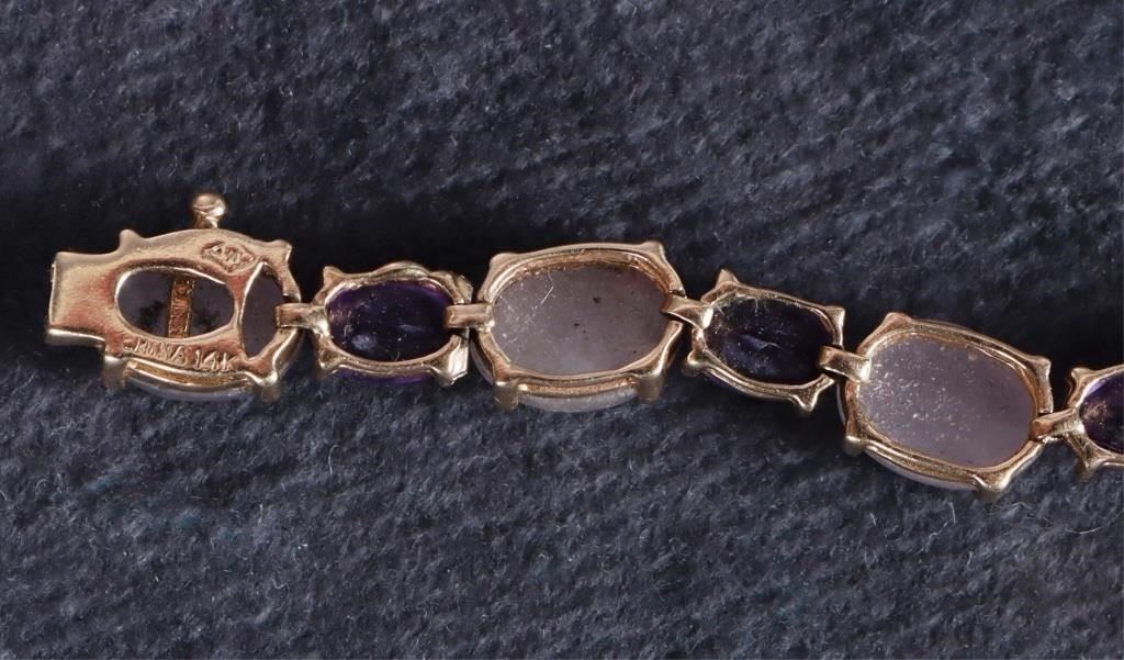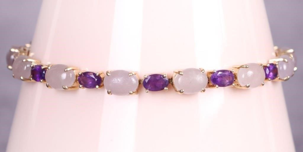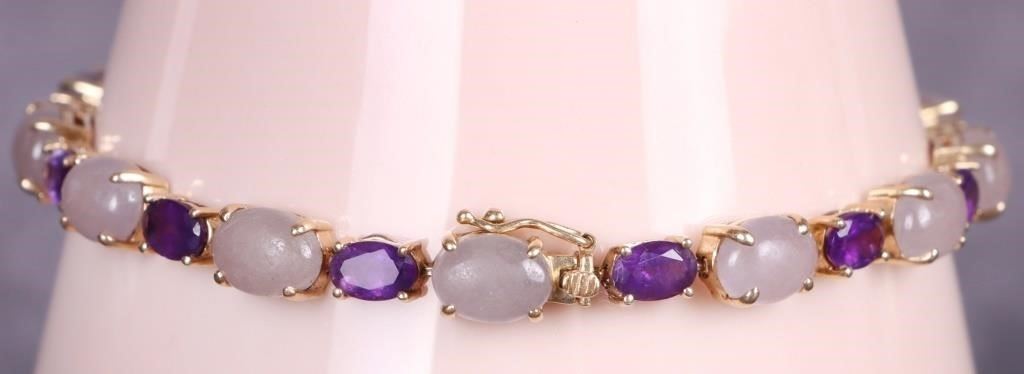 14k yellow gold purple amethyst and jade ladies bracelet with thirteen 0.50ct oval amethysts, and thirteen 1.0ct purple jade cabochons.