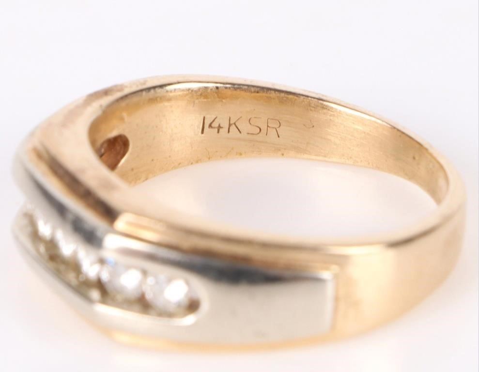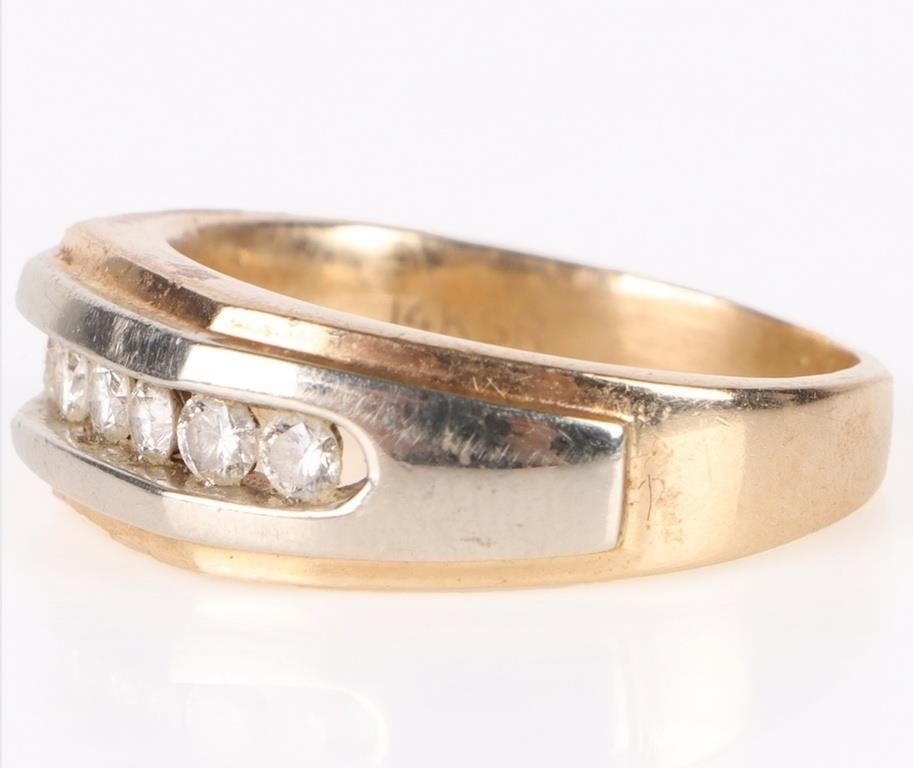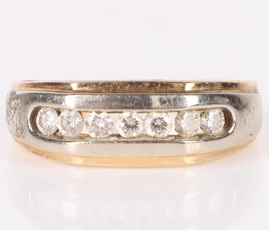 14K yellow gold round diamond men's ring. Gemstones to include seven 0.05ct round diamonds.