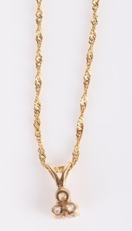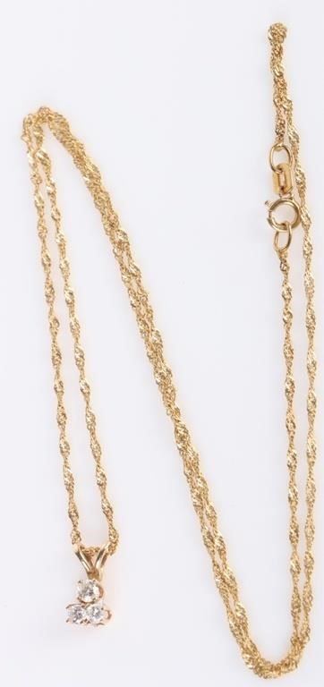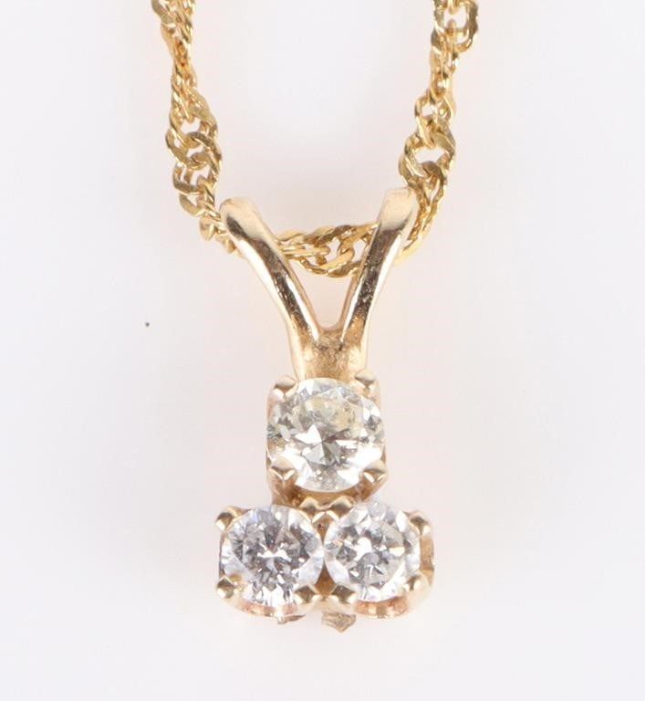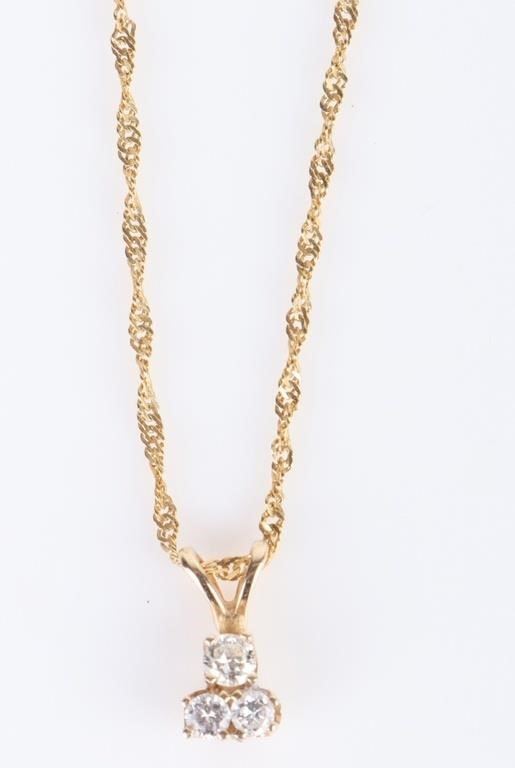 14k yellow gold sapphire ladies necklace with three 0.06ct round white sapphires.