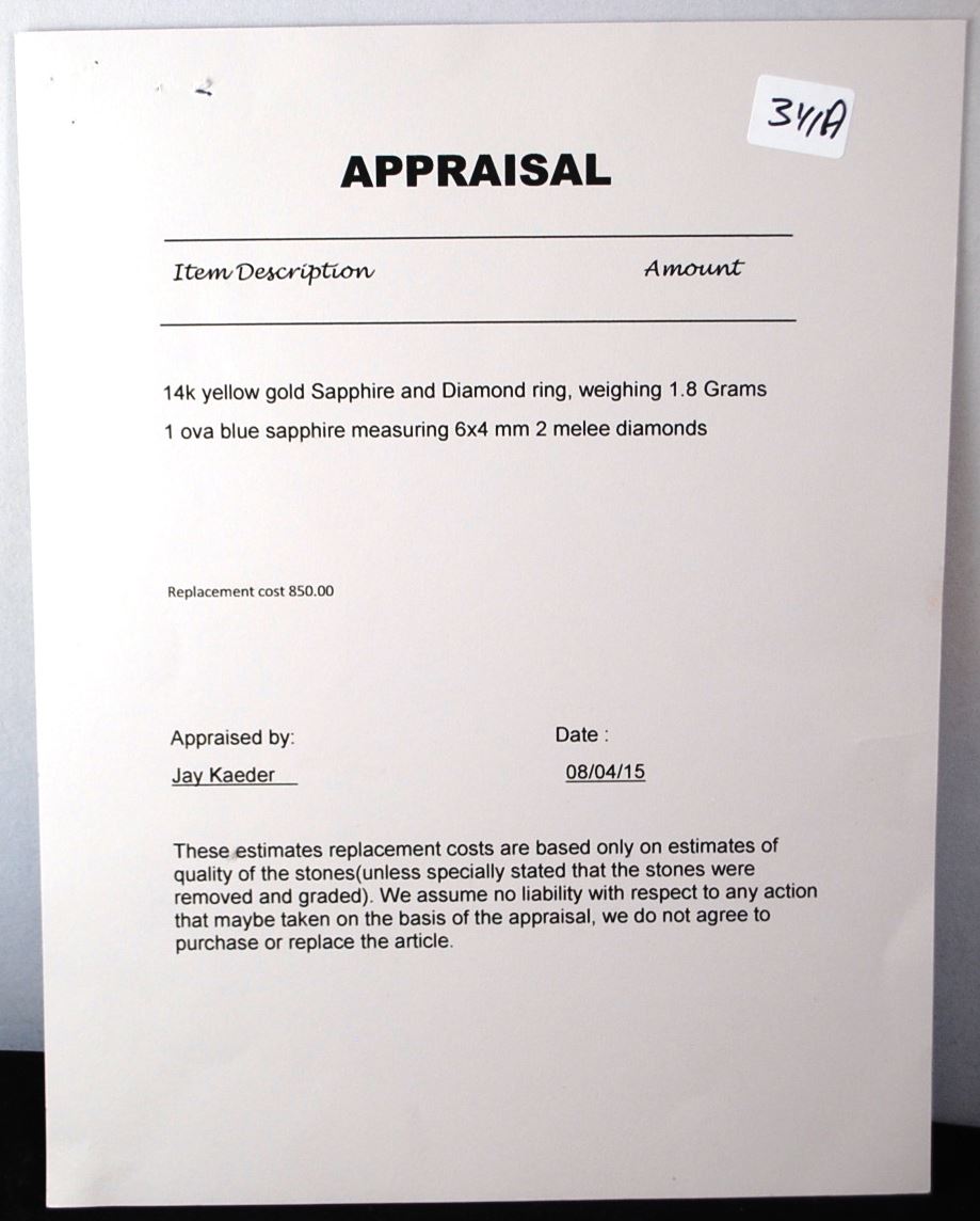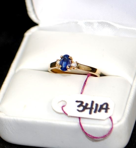14K YELLOW GOLD SAPPHIRE & DIAMOND RING, 1 OVAL BLUE SAPPHIRE AND 2 MELEE DIAMONDS. THE APPRAISED REPLACEMENT COST IS $850.00. AND COMES WITH THE APPRAISAL FOR INSURANCE PURPOSES.
