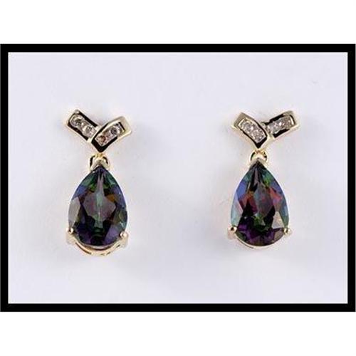This pair of earrings is exotic and alluring with its rich and unique color. 2 pear shaped mystic topazes are set in 14K yellow gold with 8 full cut diamonds that weigh approximately .08 carats TW. The earrings measure 18 millimeters (11/16 inches) x 7 millimeters (1/4 inches).