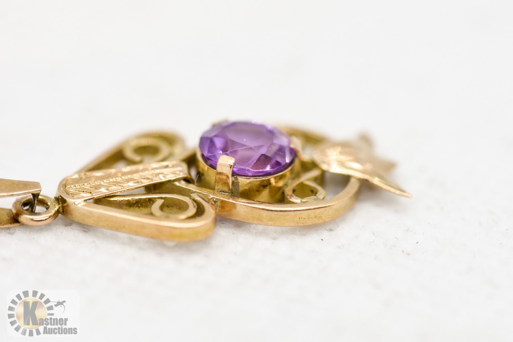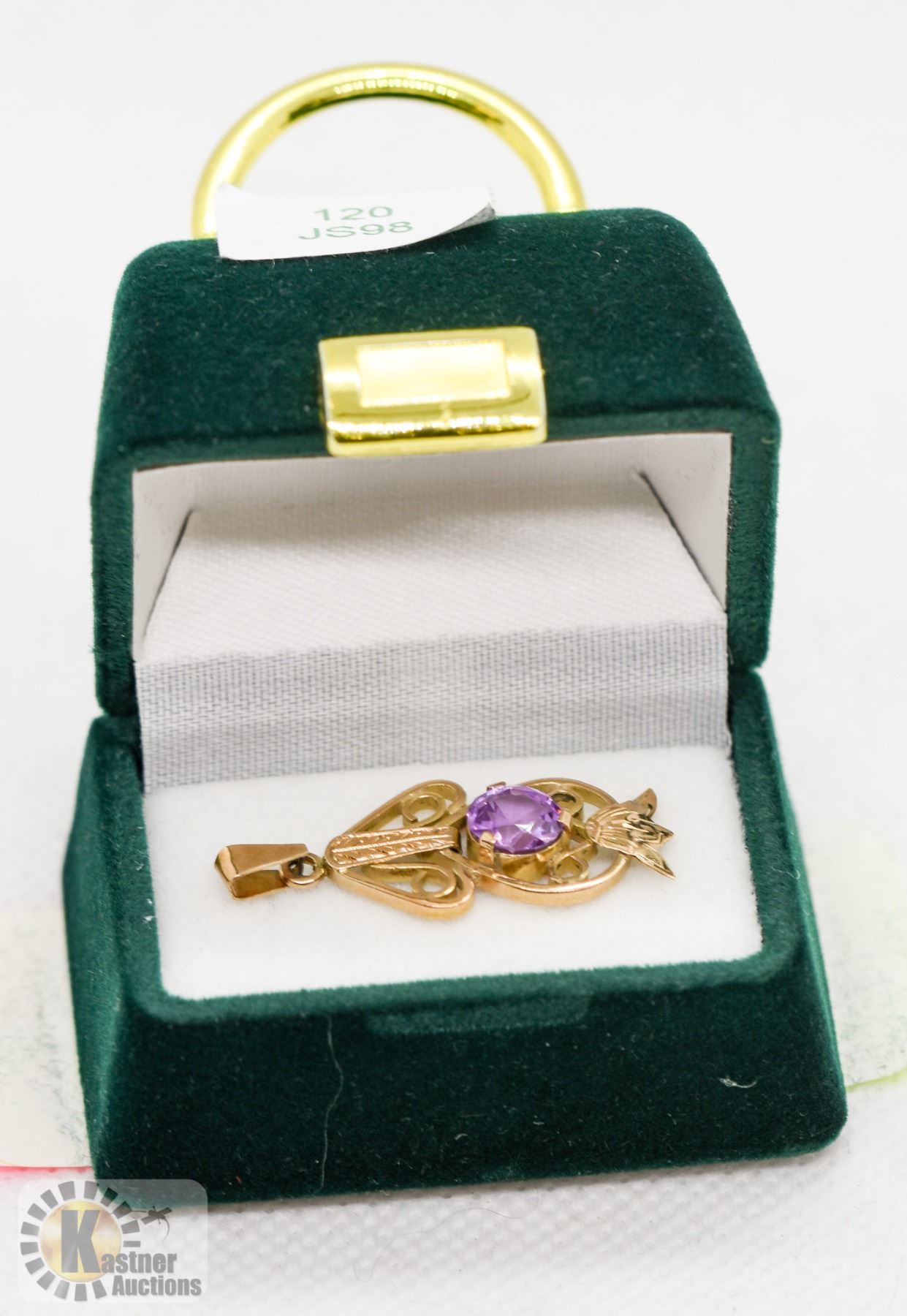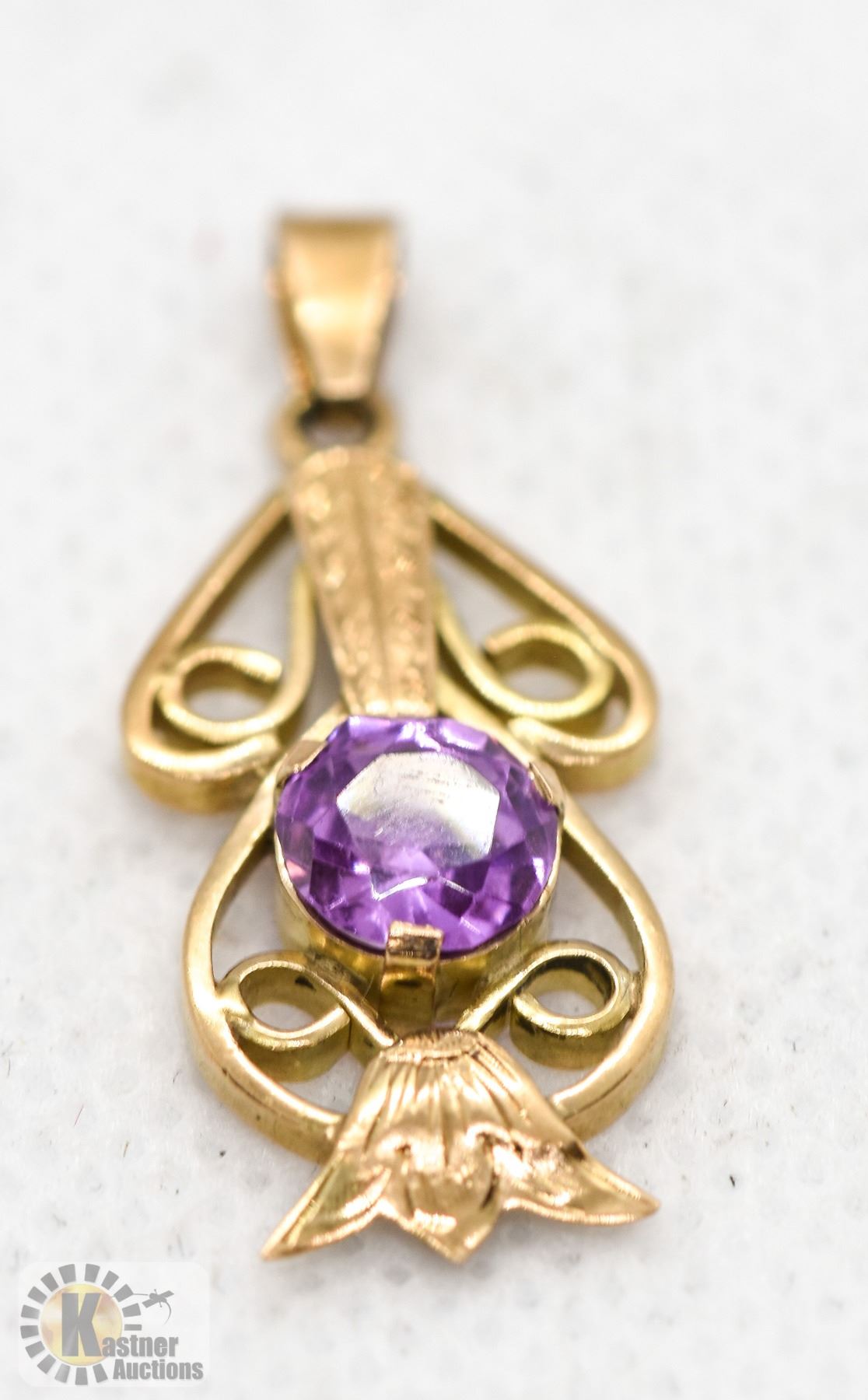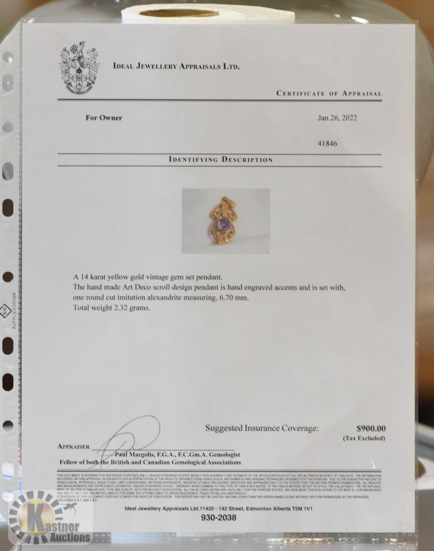 HANDMADE ART DECO SCROLL DESIGN PENDANT IS HAND ENGRAVED AND SET WITH ONE ROUND CUT IMITATION ALEXANDRITE MEASURING 6.70mm. COMES WITH CERTIFICATE OF AUTHENTICITY AND IS APPRAISED AT $900.00