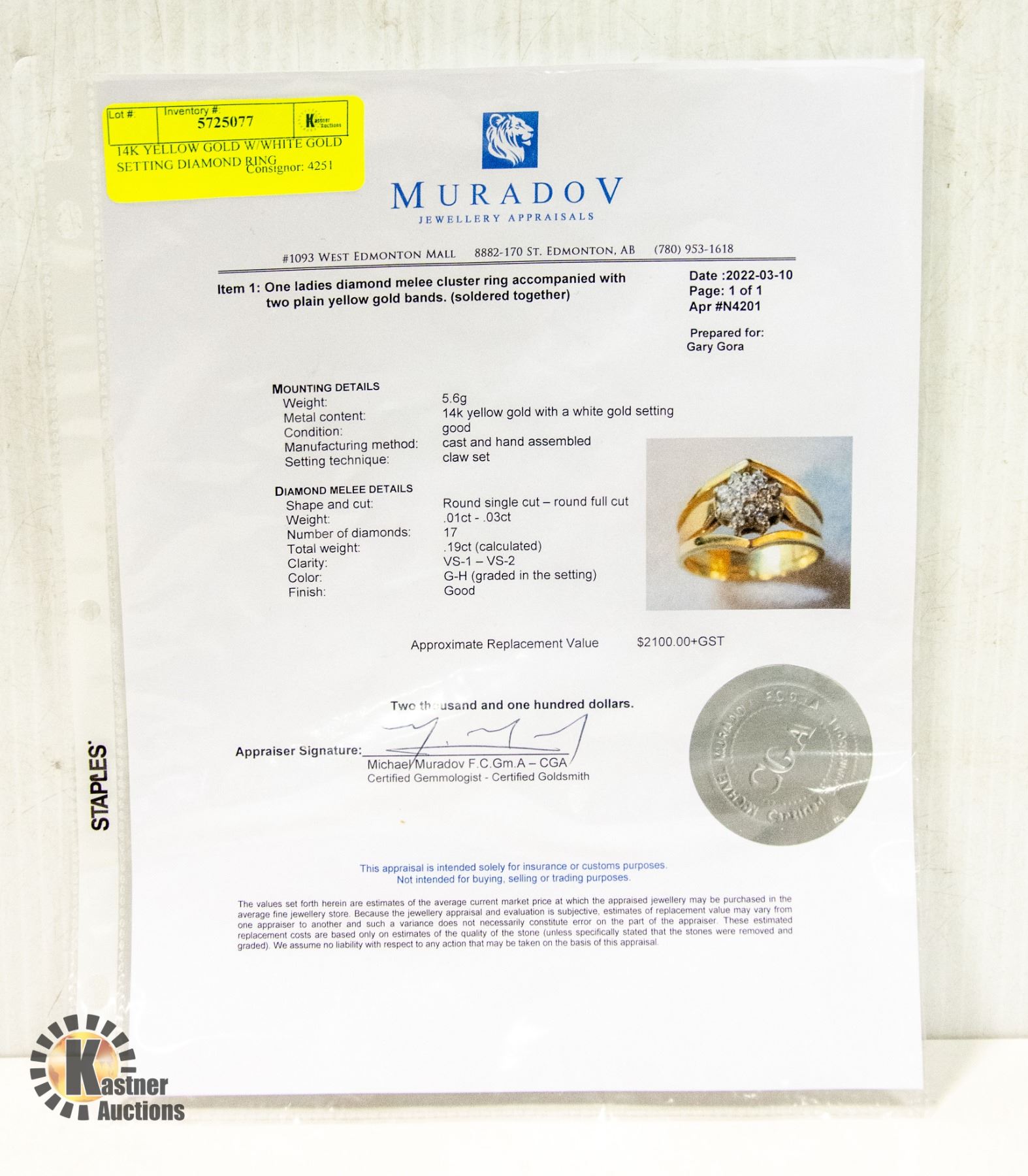 ACCOMPANIED BY 2 PLAIN YELLOW GOLD BANDS SOLDERED TOGETHER SIZE 6.5. APPRAISED AT $2100.00 **ALL ITEMS MUST BE REMOVED BY 5PM SATURDAY, NOVEMBER 18TH 2023. ALL REMAINING ITEMS WILL BE SUBJECT TO A $6.00 PER DAY STORAGE CHARGE. ANY ITEMS REMAINING AFTER MONDAY, DECEMBER 4TH, 2023 WILL BE CONSIDERED FORFEITED. NO REFUNDS WILL BE ISSUED FOR FORFEITED ITEMS. TO SCHEDULE A PICK UP APPOINTMENT CLICK HERE