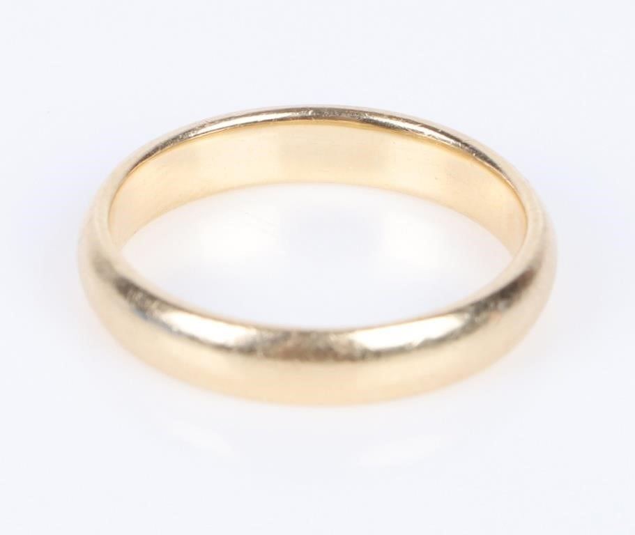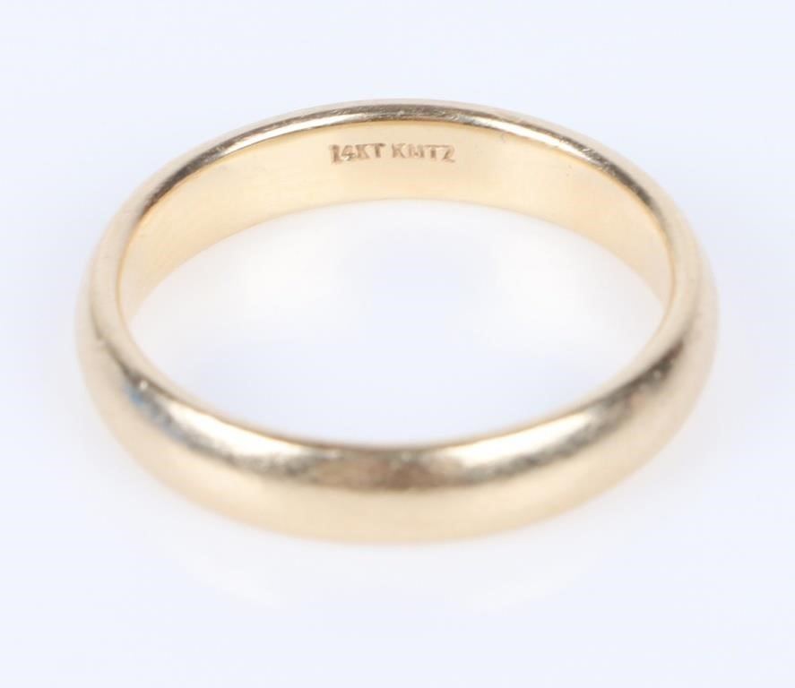 14k yellow gold mens wedding band. Inside of band is inscribed "14K KMTZ"