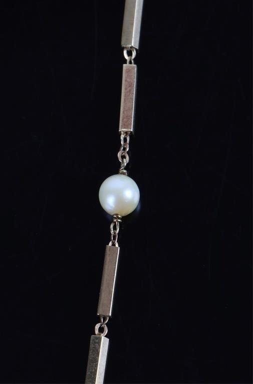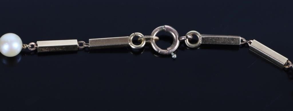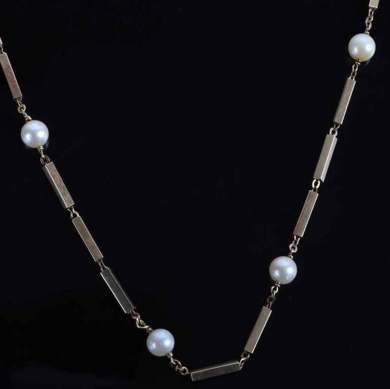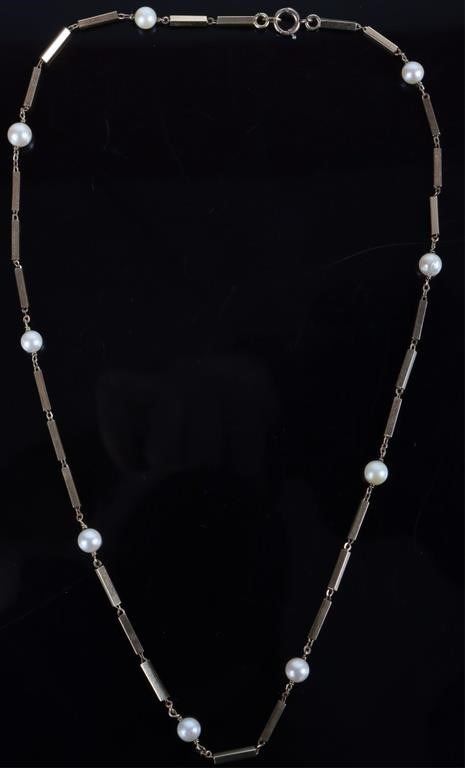 14K yellow gold white pearl ladies necklace with nine ~4.0mm white pearls.