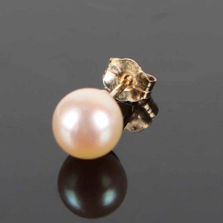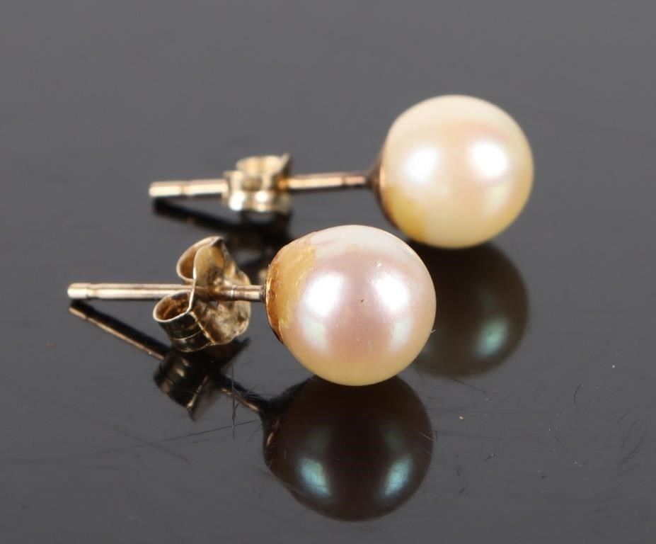 14k yellow gold white pearl ladies stud earrings with two 4.5-4.6mm white pearls.