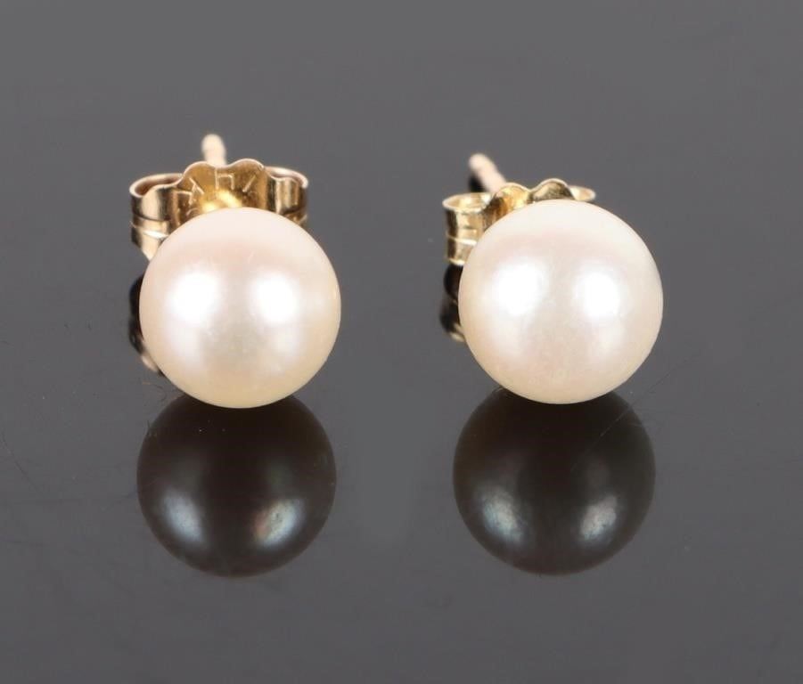 14k yellow gold white pearl ladies stud earrings with two 6.0-6.1mm white pearls.