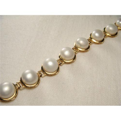 You are looking at an estate 14K yellow gold and cultured button pearl bracelet. There are 17 cultured pearls laid out in a unique gold design, each measuring 6 mm in diameter. The bracelet measures just about 7 and 1/2 inches long by 5/16 of an inch wide. It weighs 10.7 grams. It is in mint condition.