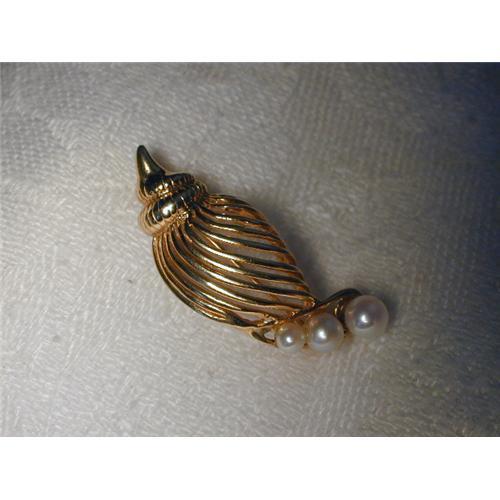 You are looking at an estate 14K yellow gold sea shell pin with cultured pearls. This unique piece features 3 pearls measuring 3 mm, 4 mm and 5 mm in diameter respectfully. The 3 pearls grace the bottom of the gold filigree seashell. This brooch measures 1.25 inches long by a bit more than .50 of an inch wide. The pin weighs 4.6 grams. It is in mint condition.