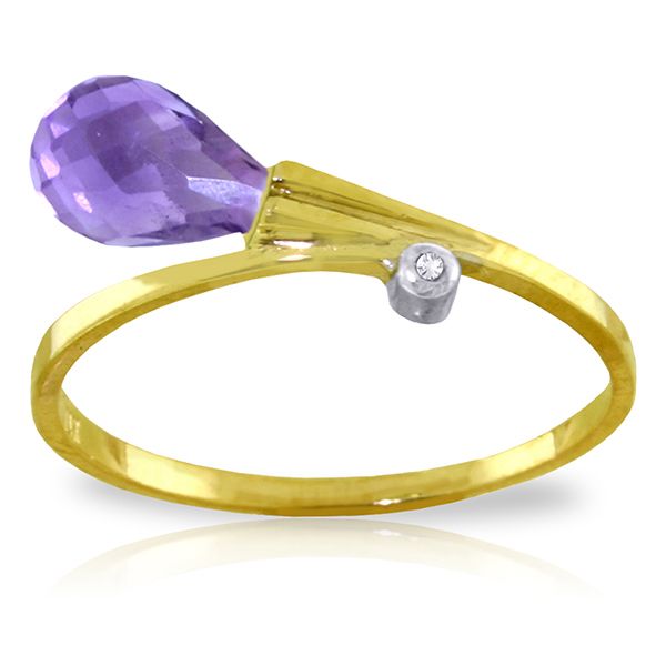 A unique style of Ring set in 14 karat Gold Band. One of the end holds a bold briolette shaped Amethyst, while the other holds a glint of Genuine Diamond!