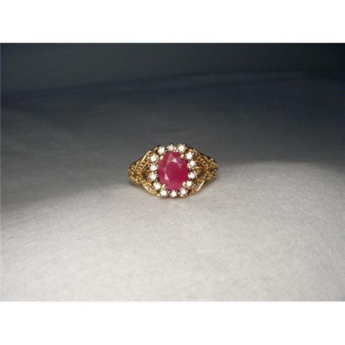 You are looking at an estate 14K yellow gold ruby and champagne diamond filigree ring. This beautiful piece features one natural oval ruby measuring 8 mm by 6 mm. The ring also features 14 brilliant round champagne diamonds measuring 2 mm each and 4 brilliant round champagne diamonds measuring 1 mm in diameter each. The top of the ring measures 1/2 of an inch long by 7/16 of an inch wide. The ring is a size 7. Sizing is available. The ring weighs 4.9 grams. It is in mint condition.