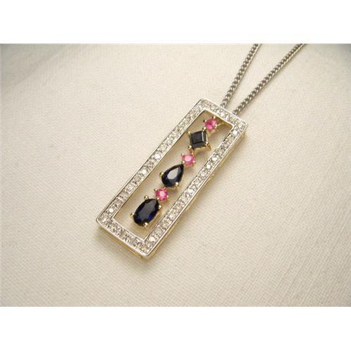 You are looking at a 14K yellow gold multi-color sapphire and diamond drop pendant. This unique piece features 3 round pink sapphires measuring 2 mm each, one oval sapphire measuring 5 mm by 3 mm, one pear shaped sapphire measuring 5 mm by 4 mm and one square shaped sapphire measuring 3 mm across. The slide also features 40 brilliant round diamonds totaling .20 of a carat. All gemstones are natural. The total weight of the sapphires is one carat. The pendant measures 1 and 3/16 of an inch long by 3/8 of an inch wide. It weighs 2.7 grams. It is in mint condition.