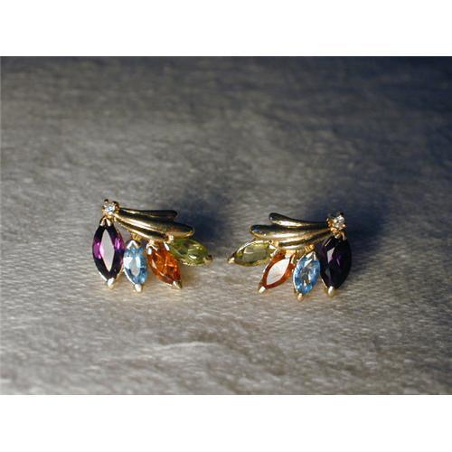 </font></strong>You are looking at a pair of estate 14K yellow gold peridot, amethyst, topaz, citrine and diamond earrings. All gemstones are natural. The stones measure from 8 mm by 4 mm to 6 mm by 3 mm. There are 2 brilliant diamonds in each gorgeous piece. Each earring measures about .50 of an inch wide by 5/8 of an inch long. The pair weighs 3.3 grams. They are in mint condition.</font>