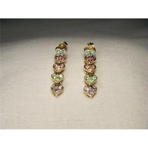 You are looking at a pair of estate 14K yellow gold heart earrings with gemstones. Each piece in this beautiful set features 5 hearts hanging from one another. There are 3 stones in each heart of either aquamarine, peridot or tanzanite and there are two hearts with pink tourmaline. All gemstones are natural and have a diameter of 2 mm each. Each earring measures one inch long by 1/4 of an inch wide. The pair weighs 4.3 grams. They are in mint condition.