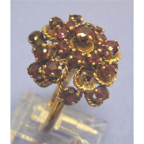 From a local estate, auction is for a lovely 14K yellow gold ring with a central 4mm ruby and twenty four additional rubies surrounding it. The gold frame is not perfectly symmetrical and could be straightenedwith some patience. 6.3 grams.