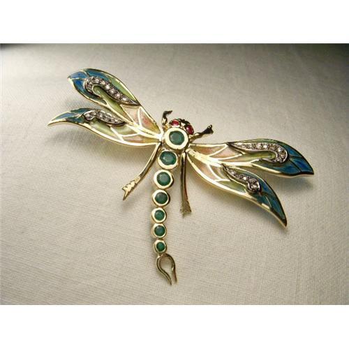 <tr><td>Title:14K YG Ruby Emerald Diamond Dragonfly Brooch</td></tr>