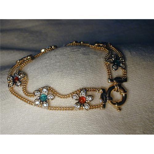 You are looking at a lovely estate 14K yellow gold floral bracelet with rubies, emeralds and diamonds. All gemstones are natural. There are 40 brilliant round diamonds making up the petals of 8 white gold flowers. There are rubies and emeralds at the center of each alternating flower. There are 4 emeralds and 4 rubies, measuring 3 mm in diameter each. This beautiful bracelet measures 7.5 inches long by more than 5/8 of an inch wide. It weighs 14.5 grams. It is in mint condition.