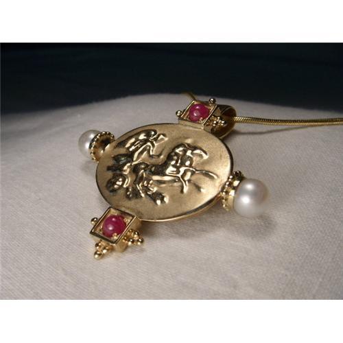 <tr><td>Title:14K YG Ruby Pearl Etruscan Pendant Brooch</td></tr>