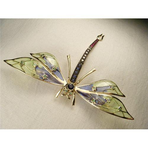 You are looking at an estate 14K yellow gold gemstone dragonfly brooch. The wings of this piece are multi-colored plique a jour enamel and contain 10 tsavorites measuring 1 mm each. The back of the dragonfly contains 2 tsavorite as the eyes, 5 sapphires, 5 rubies and 5 brilliant round diamonds measuring 1 mm each. There is also one large sapphire measuring 4 mm. All gemstones are natural. The piece measures 1 and 7/8 inches in length by 3 inches in width. The piece weighs 10.9 grams. It is in mint condition.