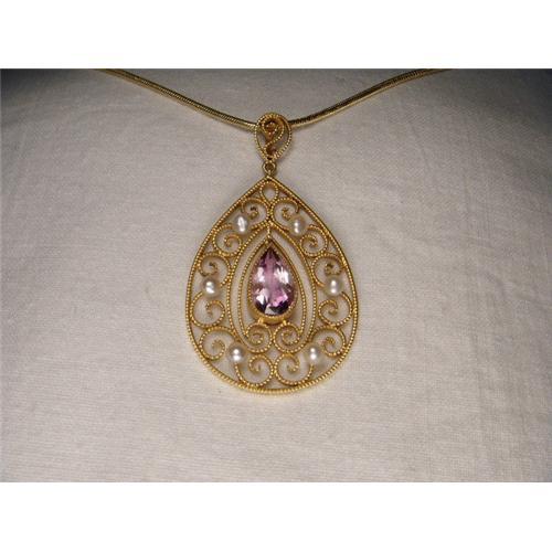 <tr><td>Title:14K YG Seed Pearl Amethyst Filigree Pendant</td></tr>