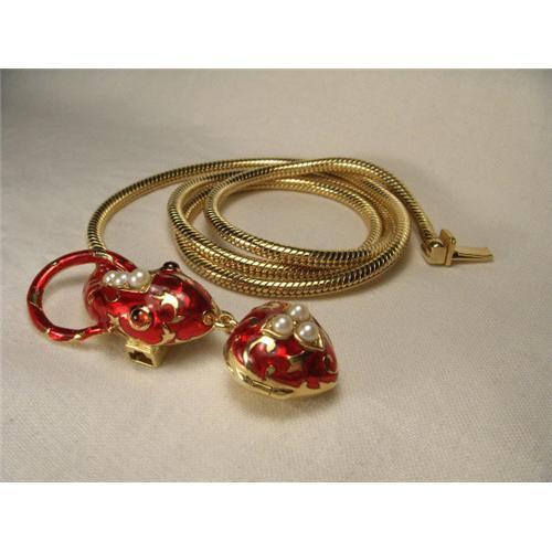 You are looking at an estate 14K yellow gold and silver enameled snake necklace. This unique piece features a snake pendant with 4 seed pearls and 2 garnets measuring 3 mm in diameter each. Hanging from the pendant is a heart shaped locket featuring 3 seed pearls and each measuring 3 mm in diameter. The entire pendant measures 2 inches long by 3/4 of an inch at it's widest point. The necklace is 19 inches long. It weighs 45.6 grams. It is in mint condition.