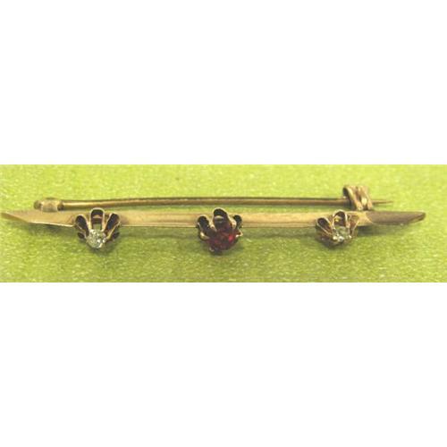 Lovely 1 7/8" wide yellow gold bar pin with a red stone and and a small approx 2.5mm diamond on either side. 2.0 grams.