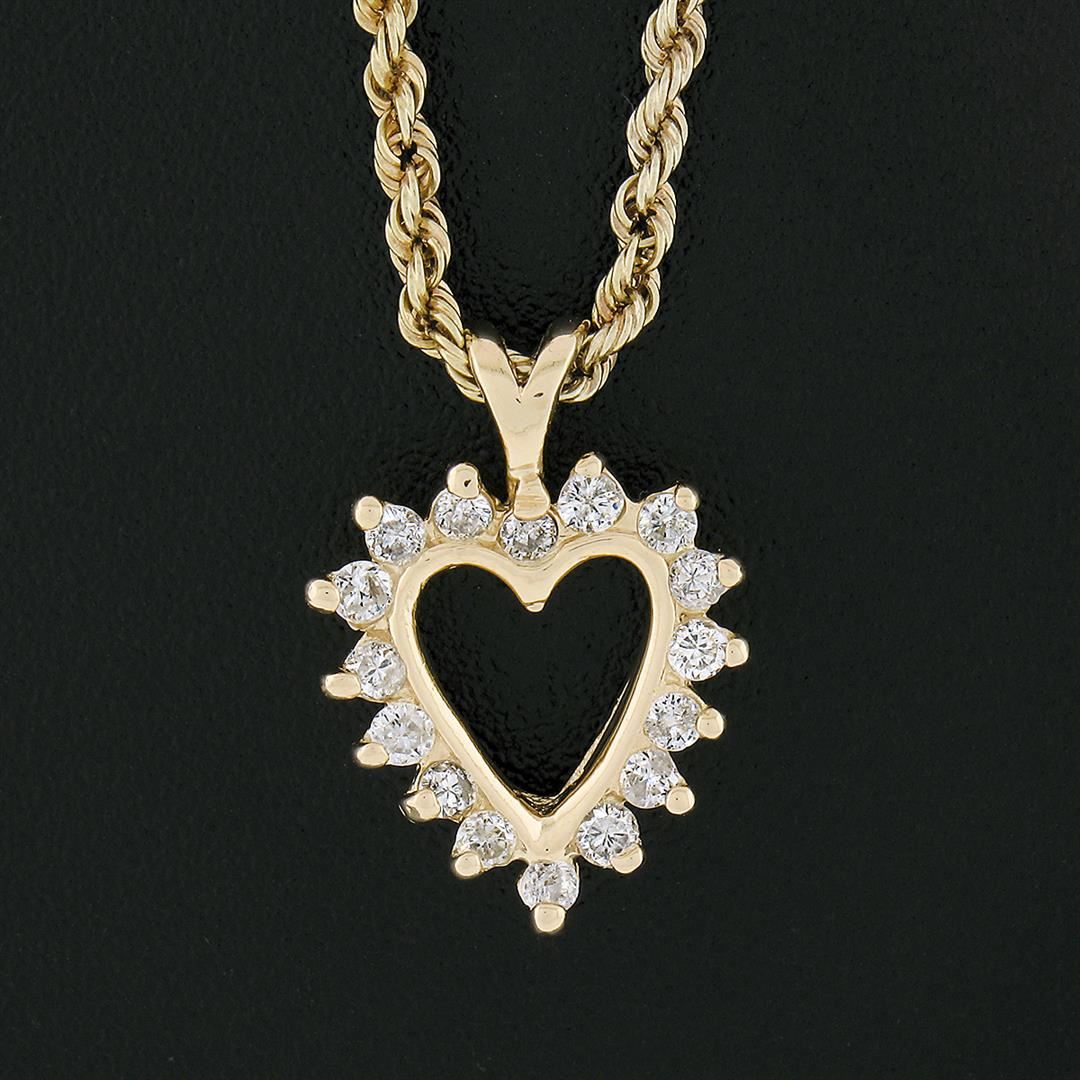 A solid 14k yellow gold heart pendant necklace, with 16 round brilliant cut natural diamonds (G/H - SI2/I1; 0.30ctw). The pendant weighs a total of 4.50 grams, measures 15.70x11.20mm including the bail, and 15.5 inch rope link chain.