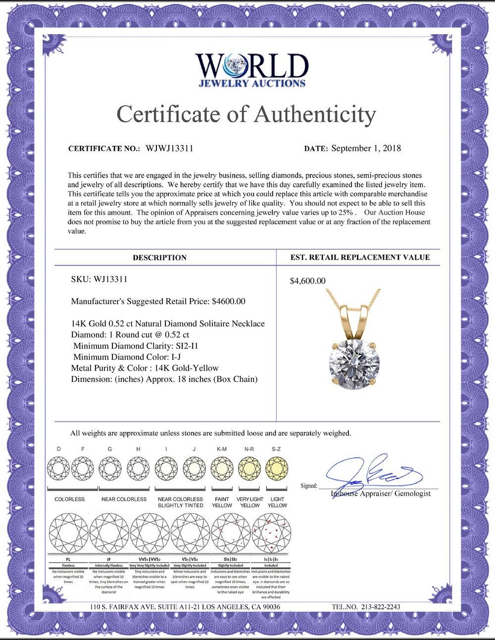 All property is sold “AS IS”, and ALL SALES ARE FINAL. Property is open to thorough public inspection. It is the Bidder’s responsibility to determine condition, age, genuineness, value or any other determinative factor. WJA may attempt to describe the merchandise in advertising and on the Internet but makes no representations. In no event shall WORLD JEWELRY AUCTION be held responsible for having made or implied any warranty of merchantability or fitness for a particular purpose. Bidder shall be the sole judge of value.
