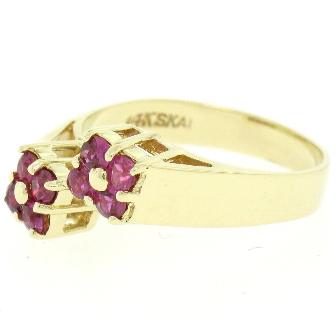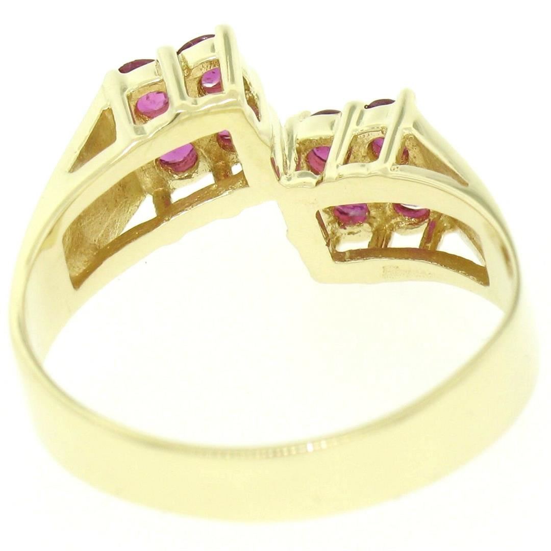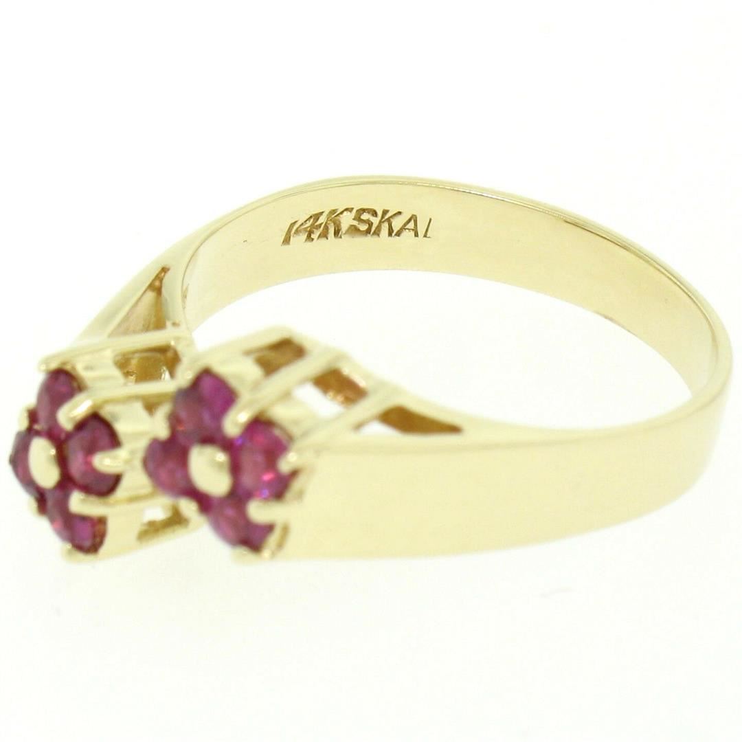 One Vintage SKAL 14K Yellow Gold 0.60ctw Dual 4 Blood Red Ruby Cluster Bypass Ring. Item Details: Material: 14K Solid Yellow Gold, Weight: 3.17 Grams, Stone(s): (8) Natural Genuine Rubies - Round Cut - Shared-Prong Set - Rich Blood Red Color, Total Carat Weight: 0.60 (approx.), Ring Size: 6.5, Ring Width: 9.30mm, Ring Height: 5.65mm rise off the finger, Signature: 14K SKAL Condition: Vintage piece. Excellent condition!