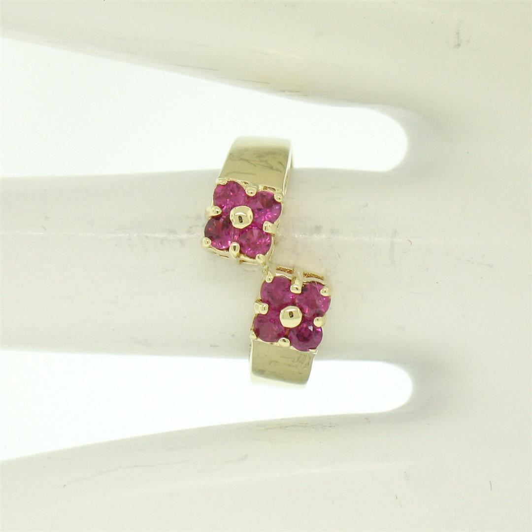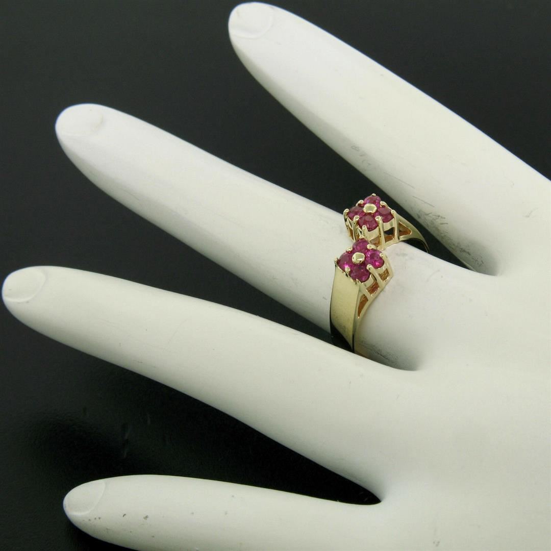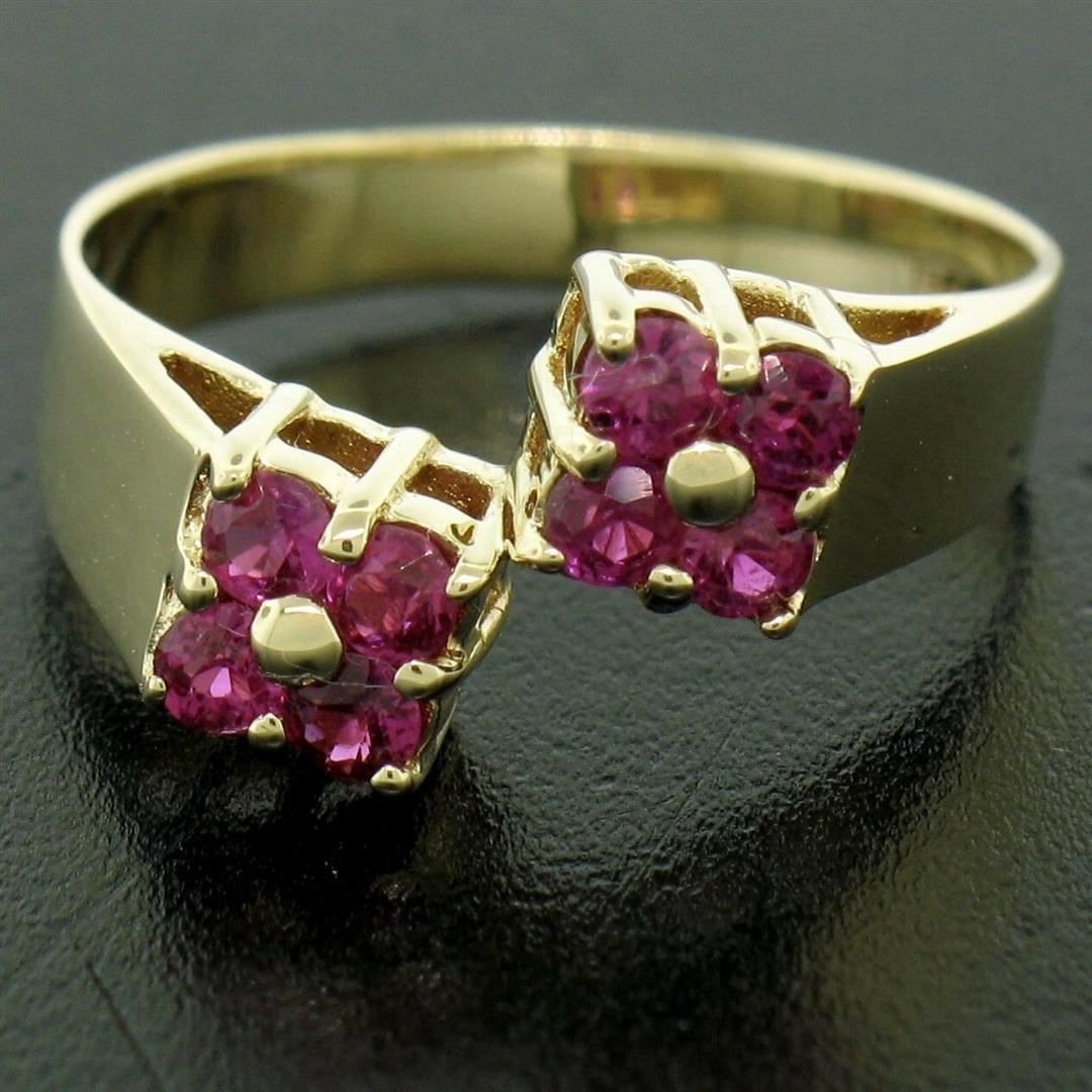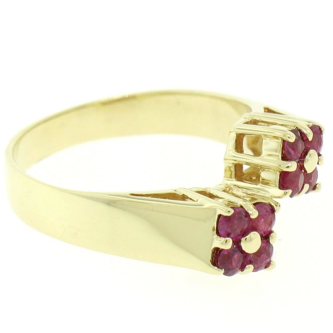 One Vintage SKAL 14K Yellow Gold 0.60ctw Dual 4 Blood Red Ruby Cluster Bypass Ring. Item Details: Material: 14K Solid Yellow Gold, Weight: 3.17 Grams, Stone(s): (8) Natural Genuine Rubies - Round Cut - Shared-Prong Set - Rich Blood Red Color, Total Carat Weight: 0.60 (approx.), Ring Size: 6.5, Ring Width: 9.30mm, Ring Height: 5.65mm rise off the finger, Signature: 14K SKAL Condition: Vintage piece. Excellent condition!