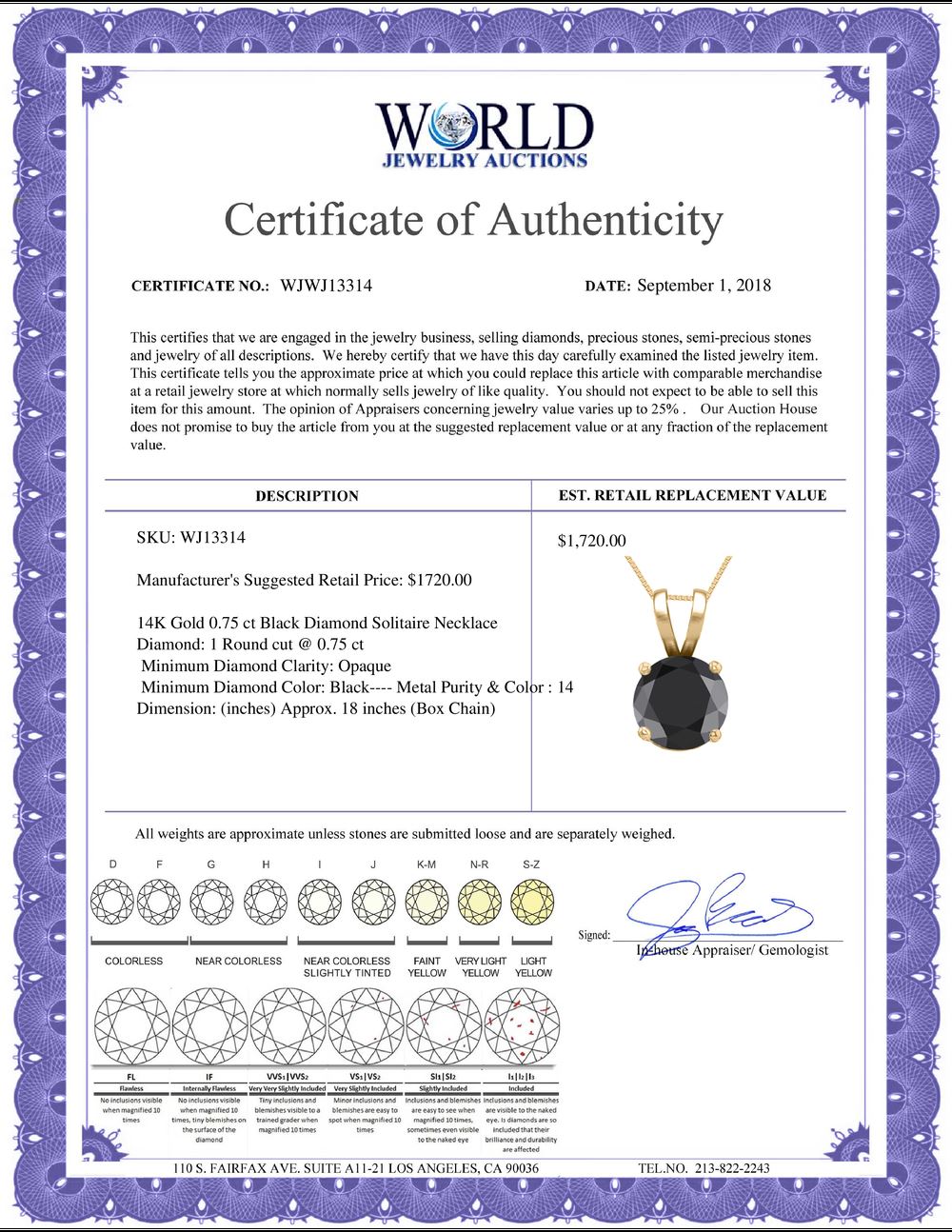 REF-53M7A - SKU: WJ13314 ---- 14K Yellow Gold 0.75 ct Black Diamond Solitaire Necklace