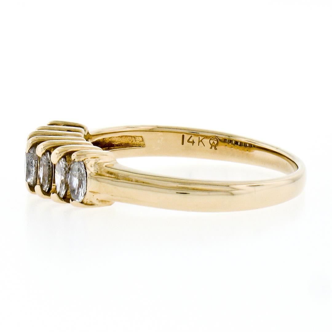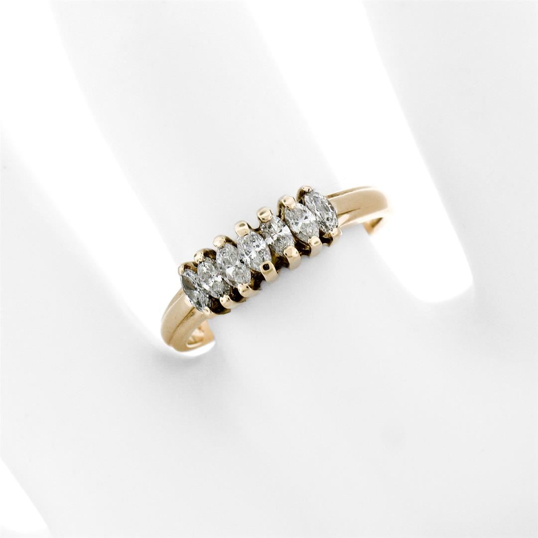 An estate soldi 14k yellow gold pyramid band ring, with 7 marquise cut cut natural diamonds (G/H- SI2/I1; 0.75ctw). The ring is size 7.0, weighs a total of 2.56 grams, and measures 4.85mm wide.