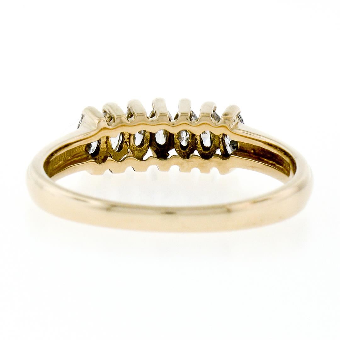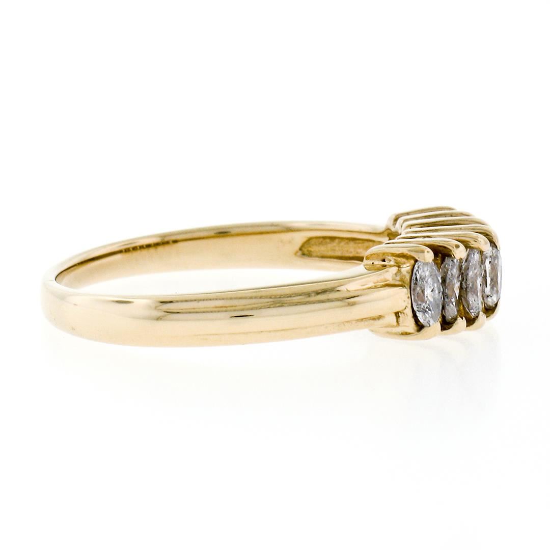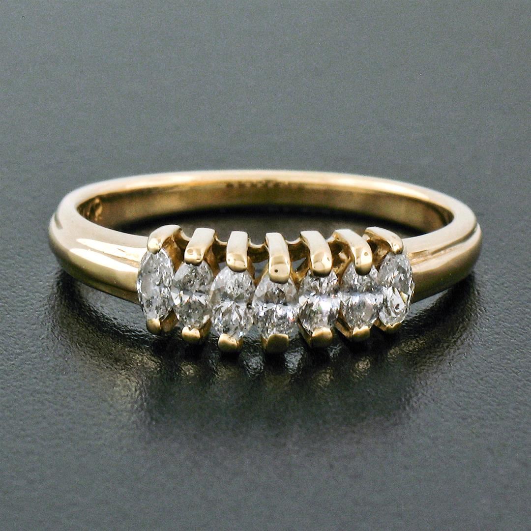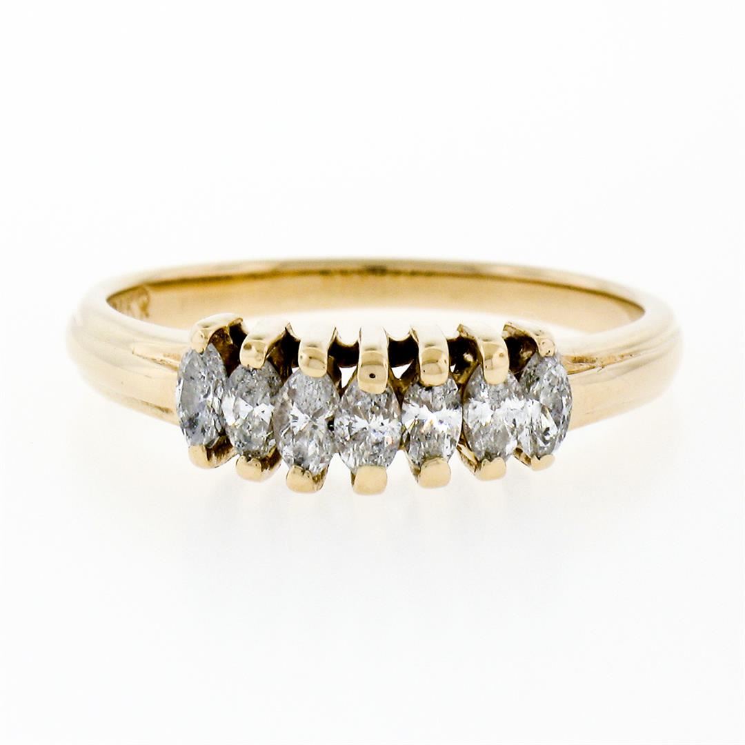 An estate soldi 14k yellow gold pyramid band ring, with 7 marquise cut cut natural diamonds (G/H- SI2/I1; 0.75ctw). The ring is size 7.0, weighs a total of 2.56 grams, and measures 4.85mm wide.