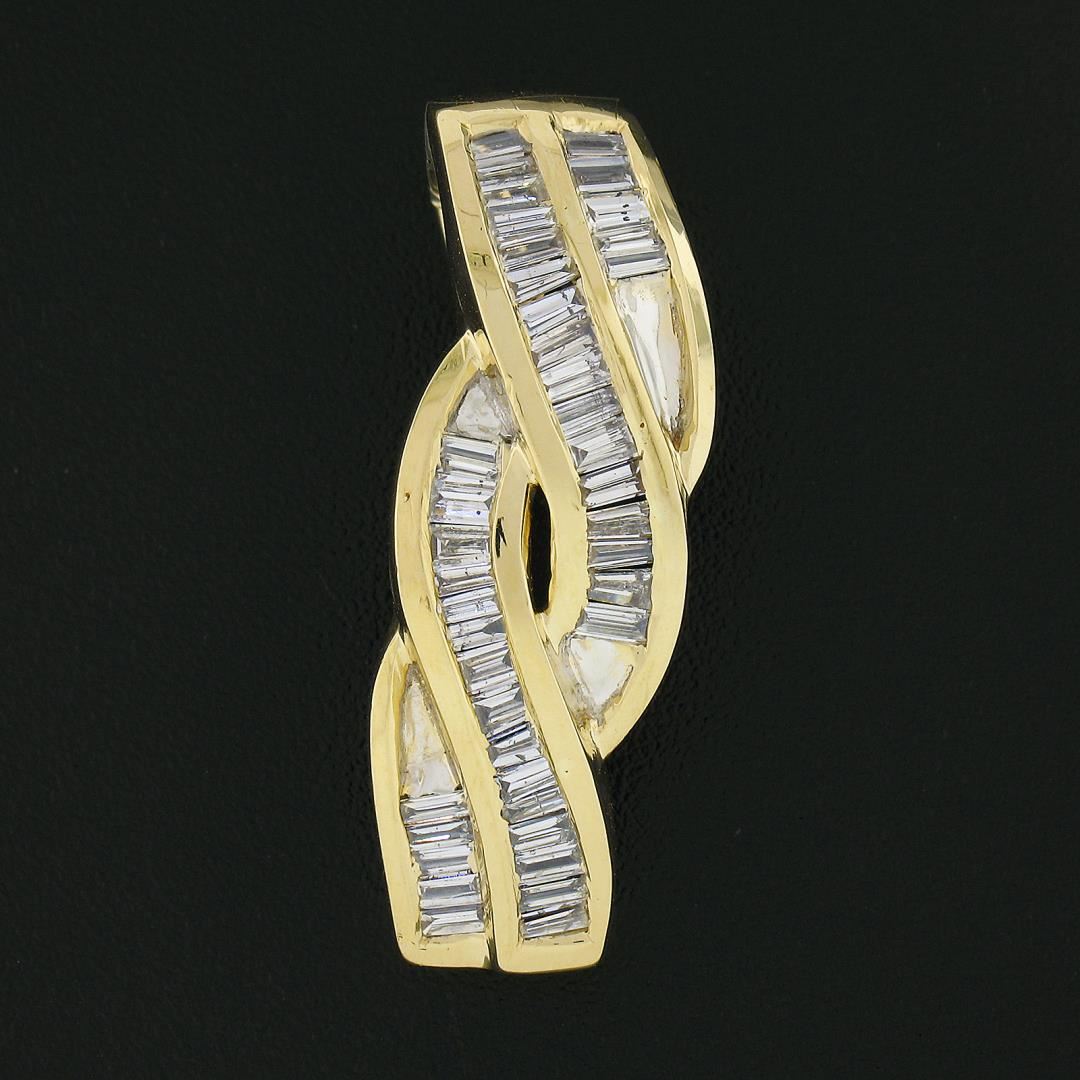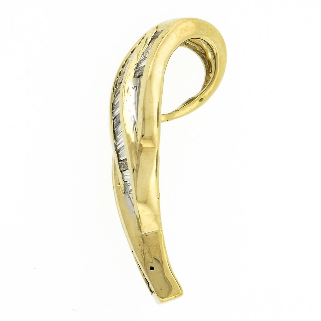 A solid 14k yellow gold slide pendant, featuring 40 straight and tapered baguette cut natural diamonds (H/I - SI1/I1 ; 0.80ctw). The pendant weighs a total of 4.67 grams, measures 30.20x10.50mm including the bail, and the inside of the bail measures 8.3x6mm.