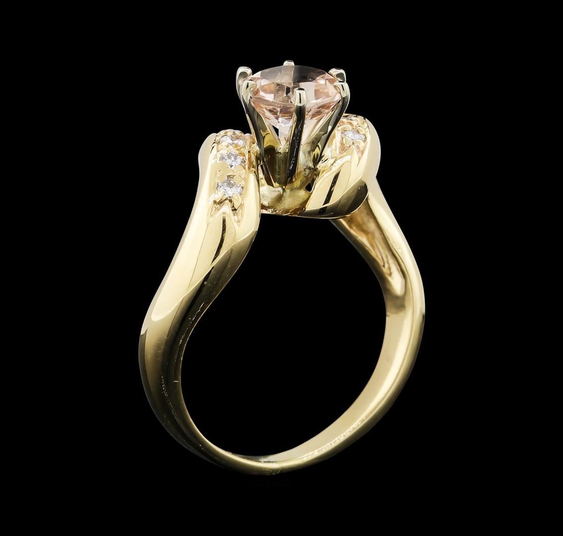 One 14K Yellow Gold 0.80ct Morganite and Diamond Ring containing (1) Prong Set approximately 0.80ct Round Cut Morganite, and (8) Round Cut Diamonds weighing approximately 0.15ctw. The total weight of the ring is 4.4 grams.