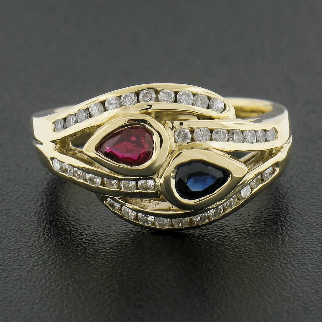 A solid 14k yellow gold bypass ring, with 1 pear cut natrual ruby (0.30ct), 1 pear cut natural sapphire (0.30ct), and 36 round cut natural diamonds (G/H - SI2-I2 ; 0.36ctw). The ring is size 6.5, weighs a total of 6.30 grams, and measures 11.2mm wide.