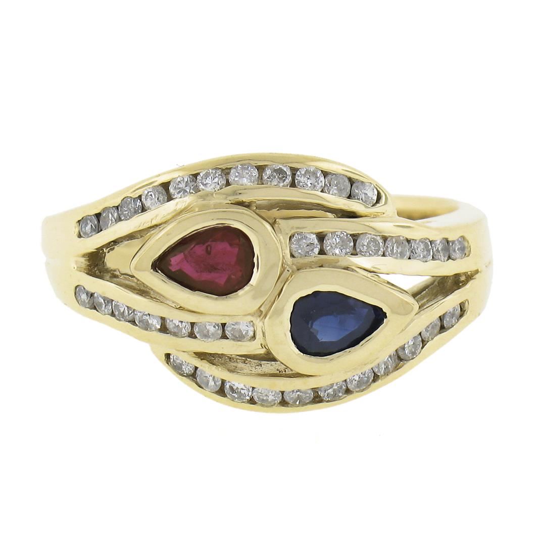 A solid 14k yellow gold bypass ring, with 1 pear cut natrual ruby (0.30ct), 1 pear cut natural sapphire (0.30ct), and 36 round cut natural diamonds (G/H - SI2-I2 ; 0.36ctw). The ring is size 6.5, weighs a total of 6.30 grams, and measures 11.2mm wide.