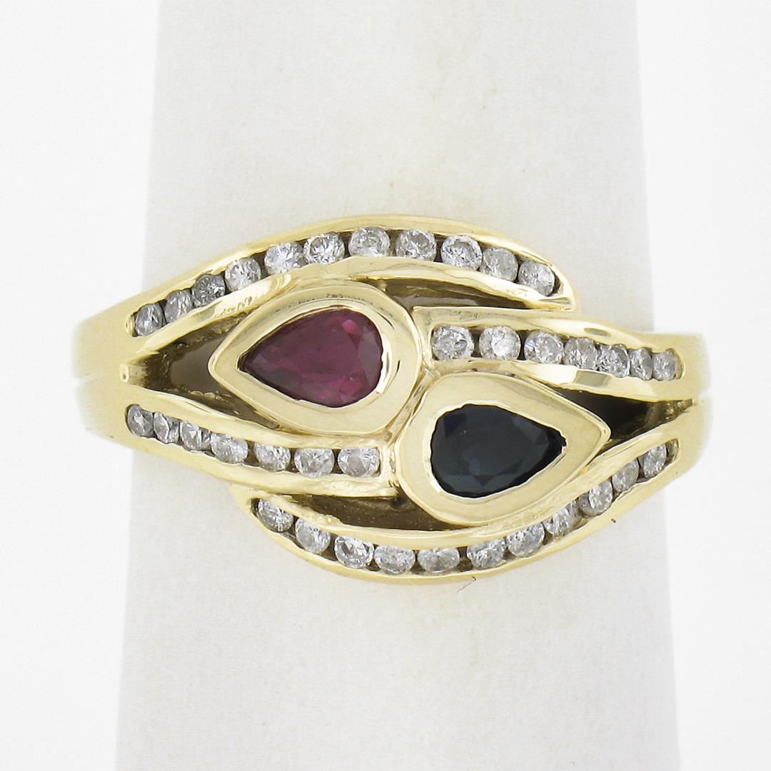 A solid 14k yellow gold bypass ring, with 1 pear cut natrual ruby (0.30ct), 1 pear cut natural sapphire (0.30ct), and 36 round cut natural diamonds (G/H - SI2-I2 ; 0.36ctw). The ring is size 6.5, weighs a total of 6.30 grams, and measures 11.2mm wide.