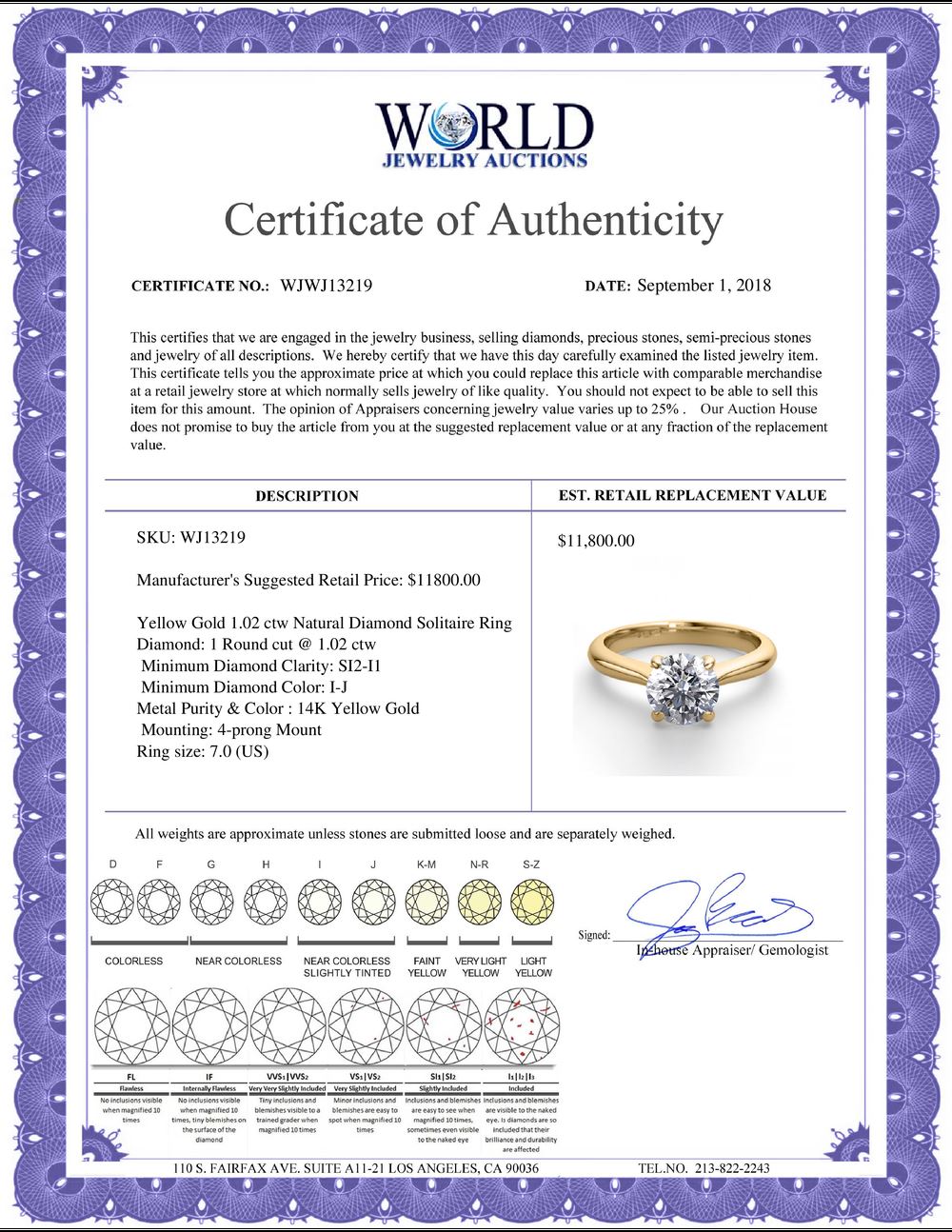 WORLD JEWELRY AUCTION believes to the best of its knowledge that the information presented in any listing has come from reliable sources. Such information is presented solely for the convenience of the Purchaser. WJA makes no warranties of any kind related to the information presented in any listing. WJA further makes no warranties, either express or implied, relating to the value, marketability or condition of the lot described in any listing. Prospective bidders should investigate a lot thoroughly before bidding. By bidding the Bidder acknowledges that Bidder has investigated the lot to his or her satisfaction, or, that Bidder has chosen not to do so, and agrees to accept the lot being bid on with no objections after the sale closes. If you are uncertain please contact us with your questions prior to bidding. If you are still uncertain after we reply, please refrain from bidding. Photos other graphic material contained in any listing of generic or duplicate lots may be stock presentations and not necessarily of the specific lot.