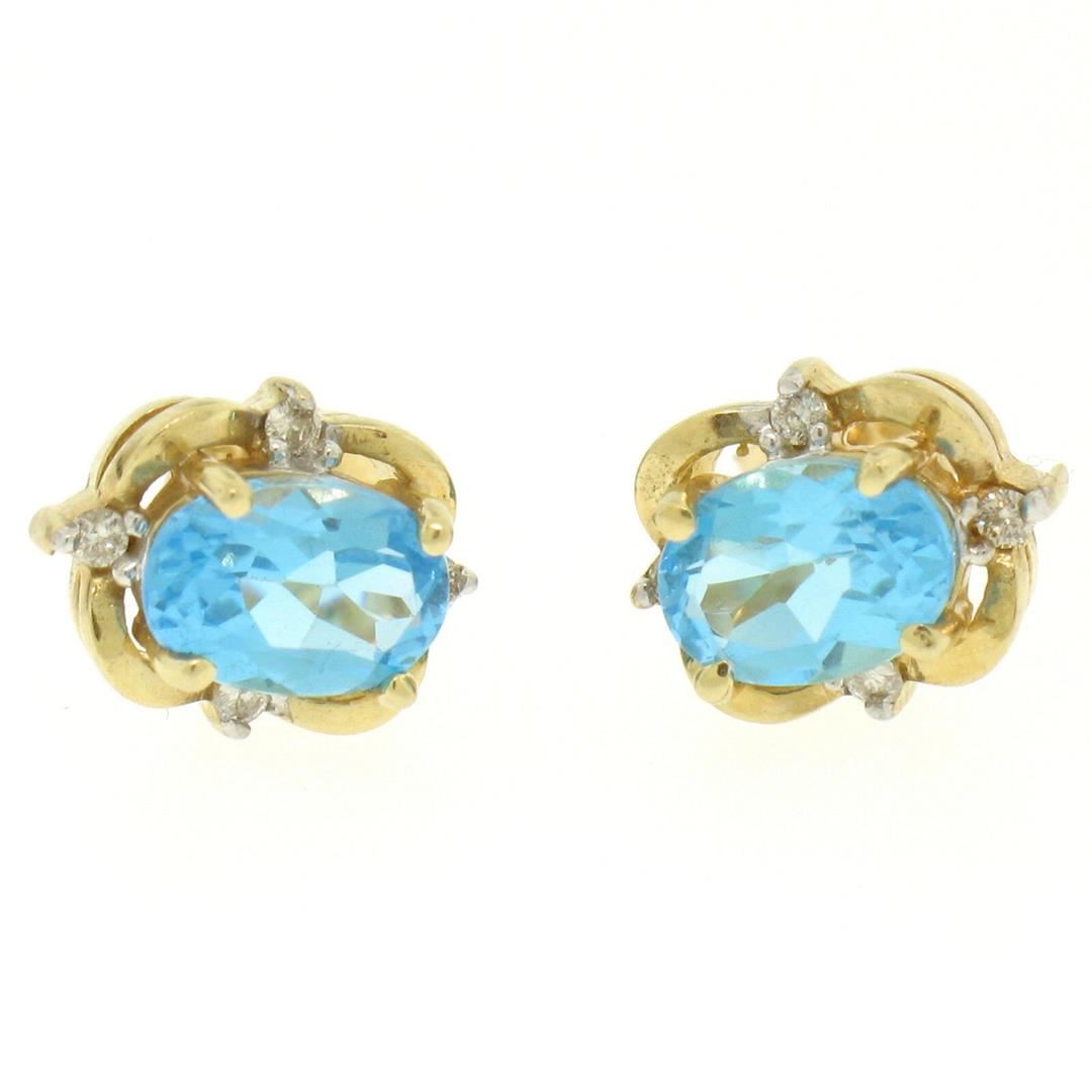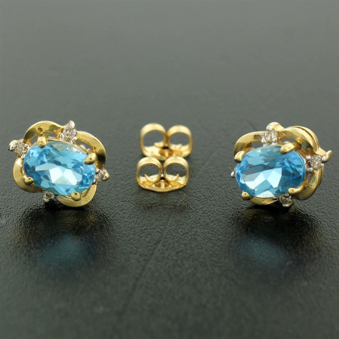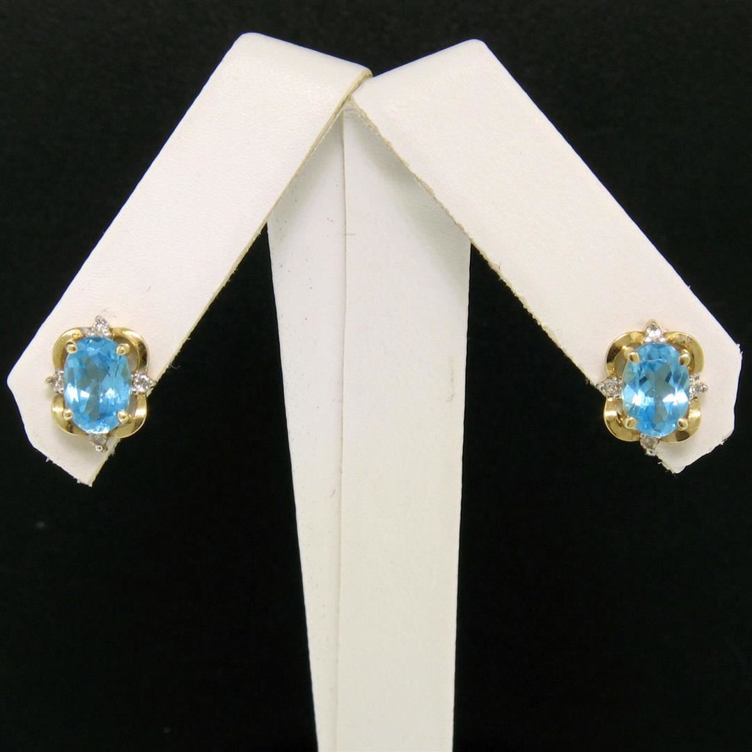 One 14K Solid Yellow Gold 1.18ctw Oval Blue Topaz & Round Diamond Halo Stud Earrings. Item Details - Material: 14K Solid Yellow Gold, Weight: 2.3 Grams, Stone(s): (2) Natural Genuine Topaz - Oval Cut - Vivid Blue Color - 1.14ctw (approx.), (8) Natural Genuine Diamonds - Round Brilliant Cut - J Color - SI2 Clarity - 0.04ctw (approx.), Total Carat Weight: 1.18 (approx.), Backing: Post backing w/ butterfly fastening , Width: 8.4mm, Height: 10.35mm, Thickness: 5.8mm, Condition: Excellent condition!