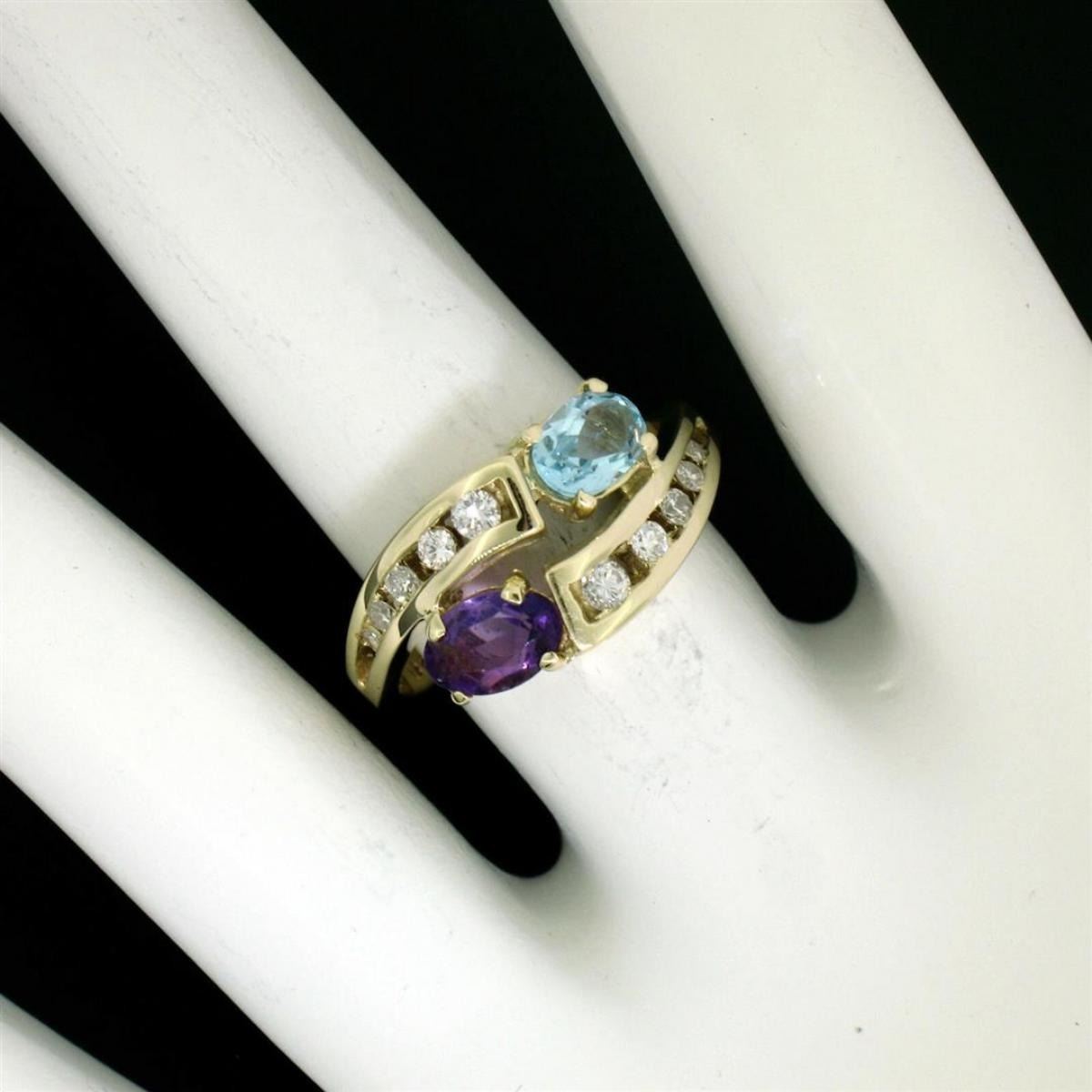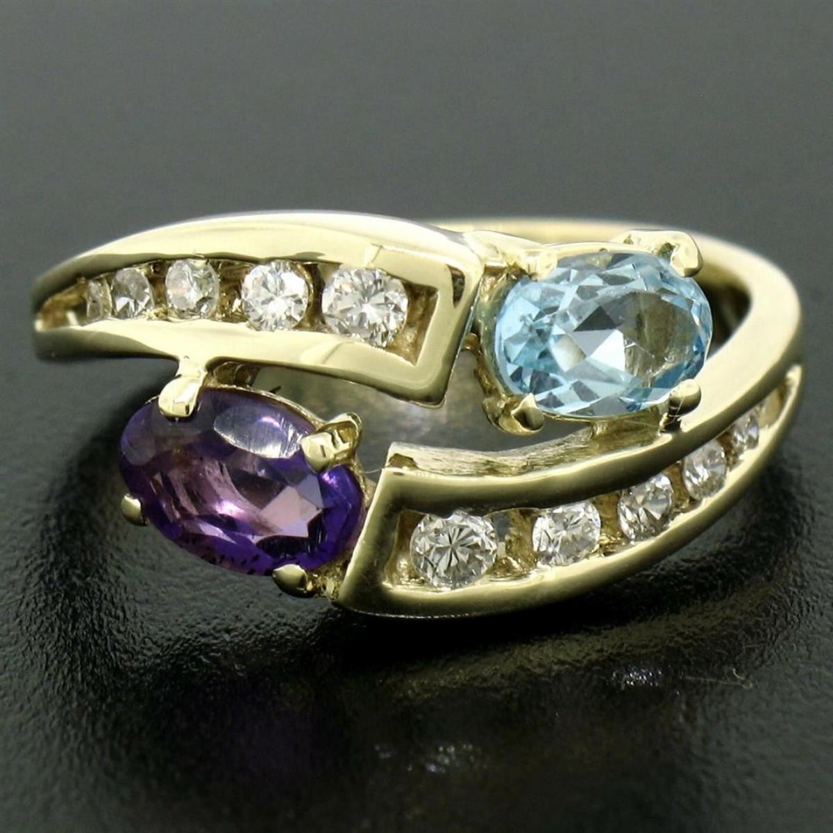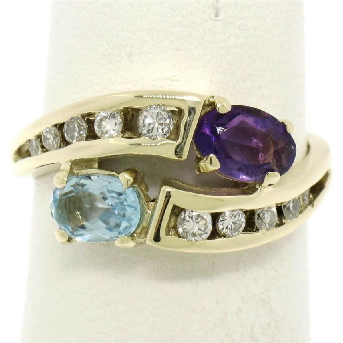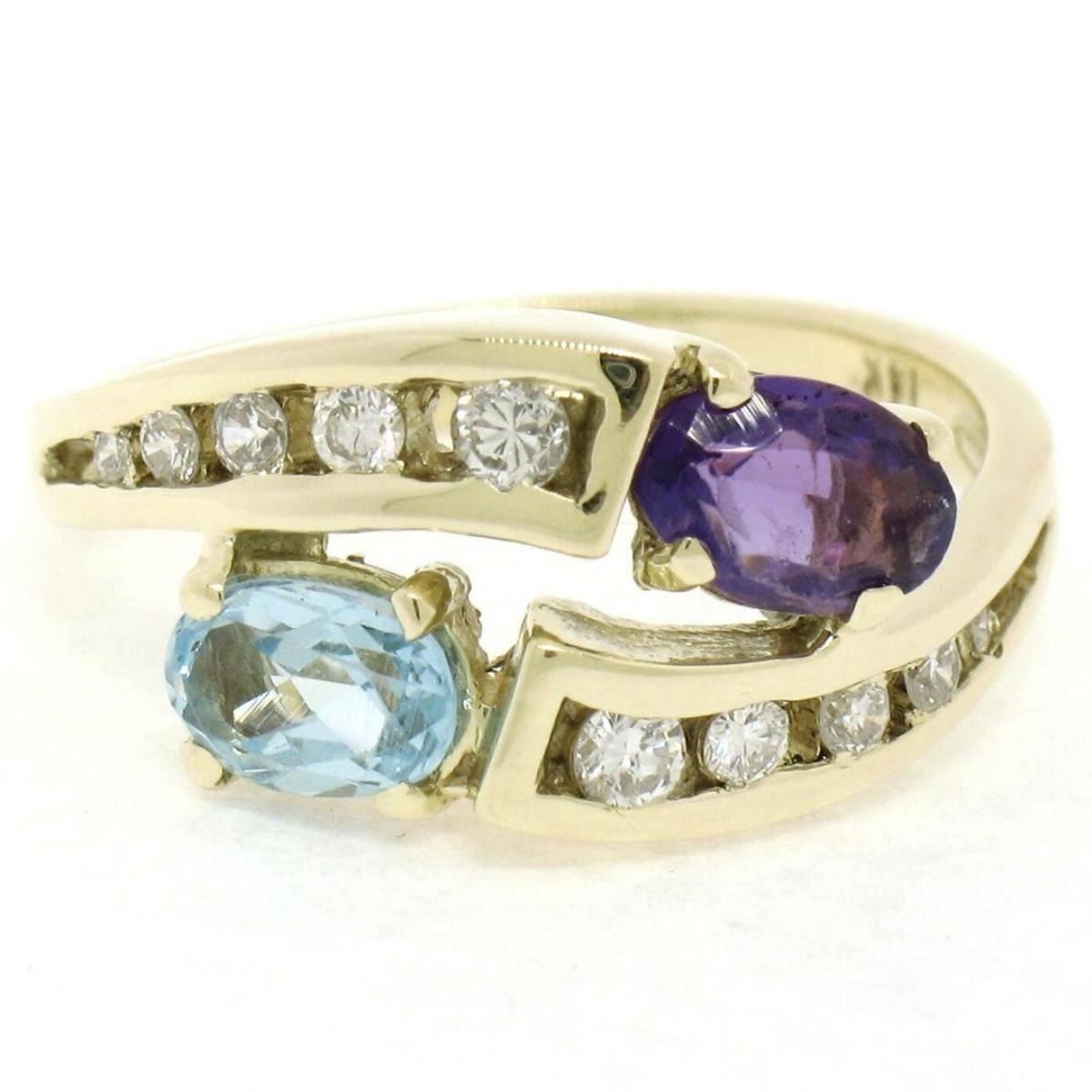 14K Yellow Gold 1.21 ctw Oval Amethyst & Blue Topaz Bypass Ring w/ Round Diamond