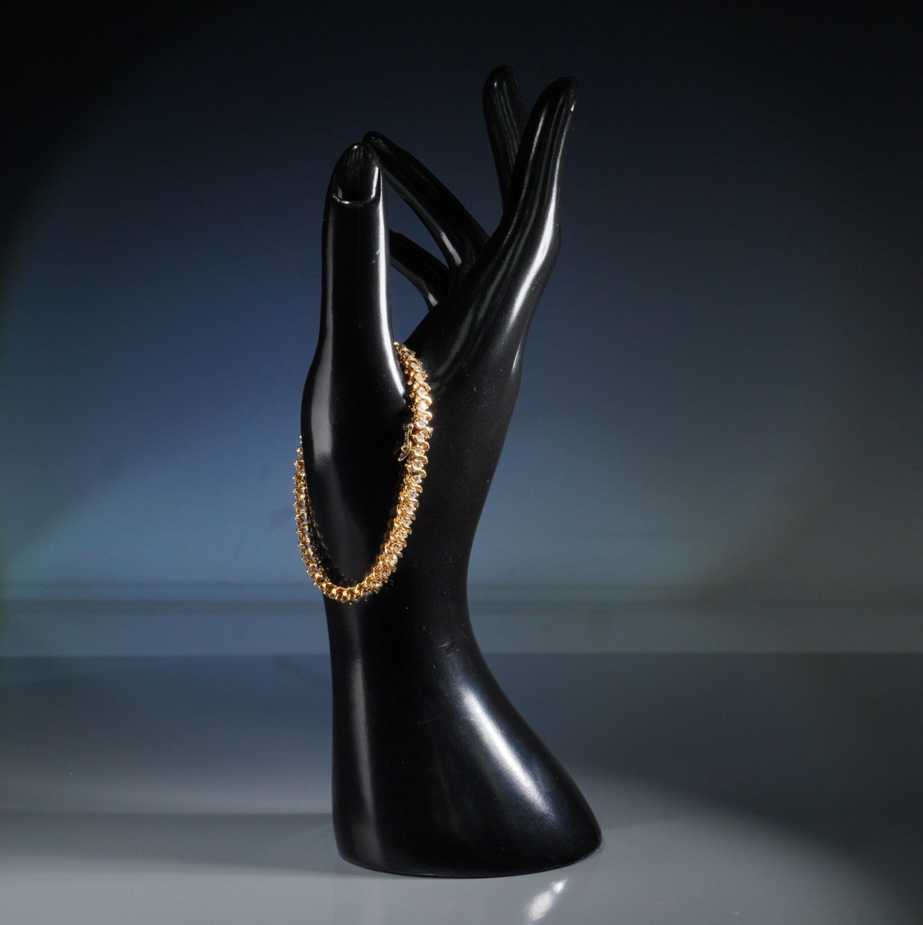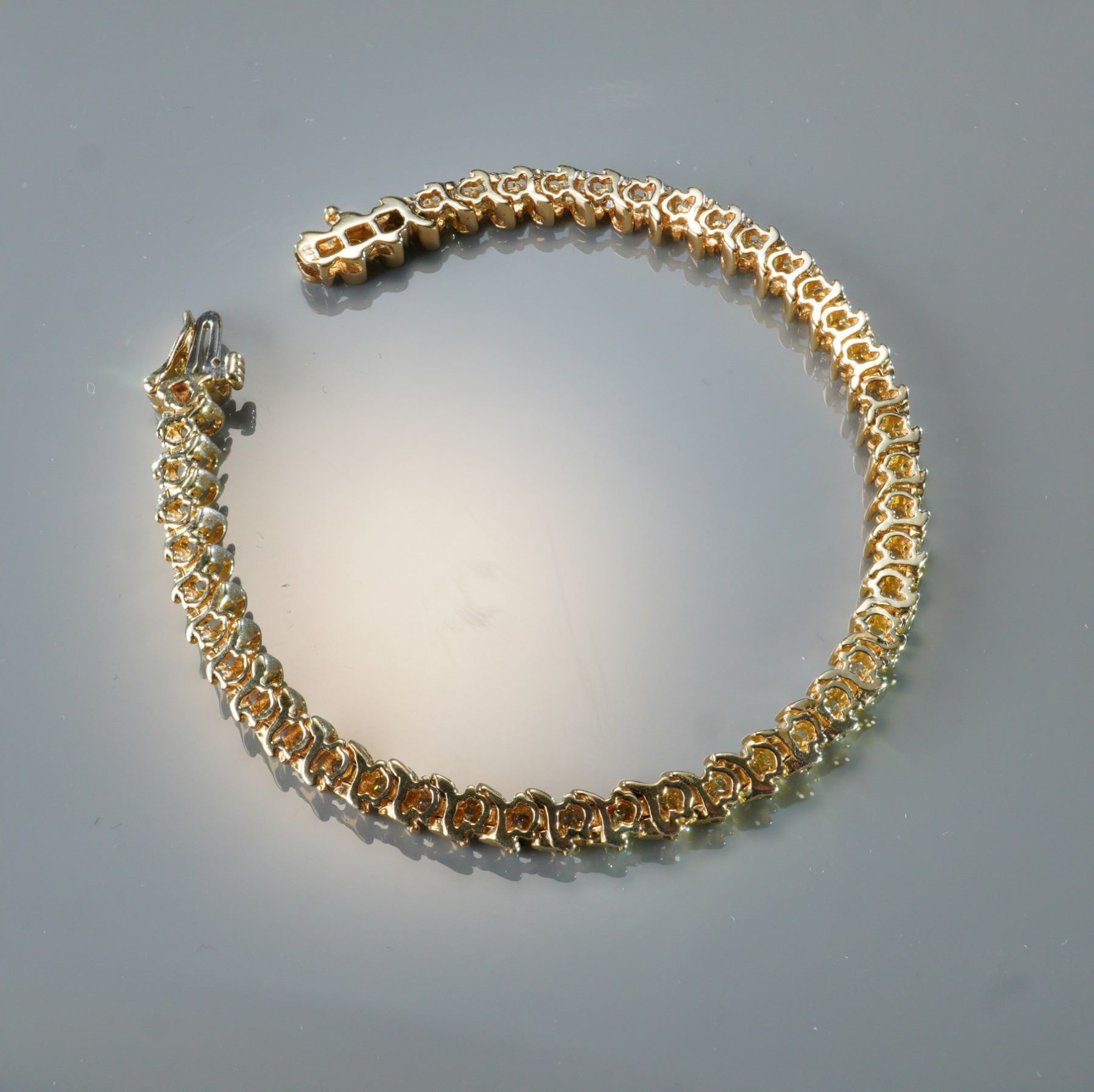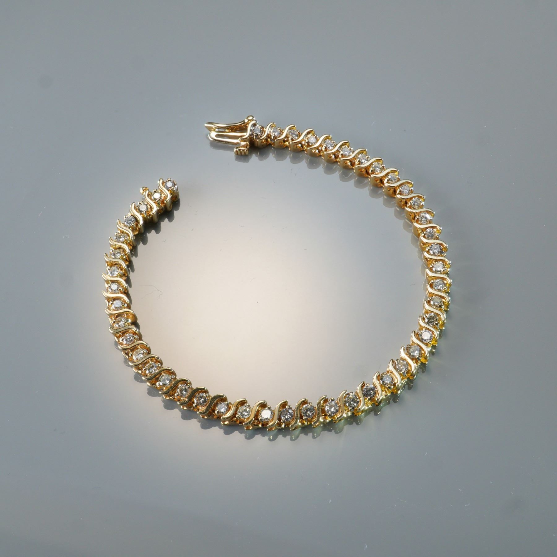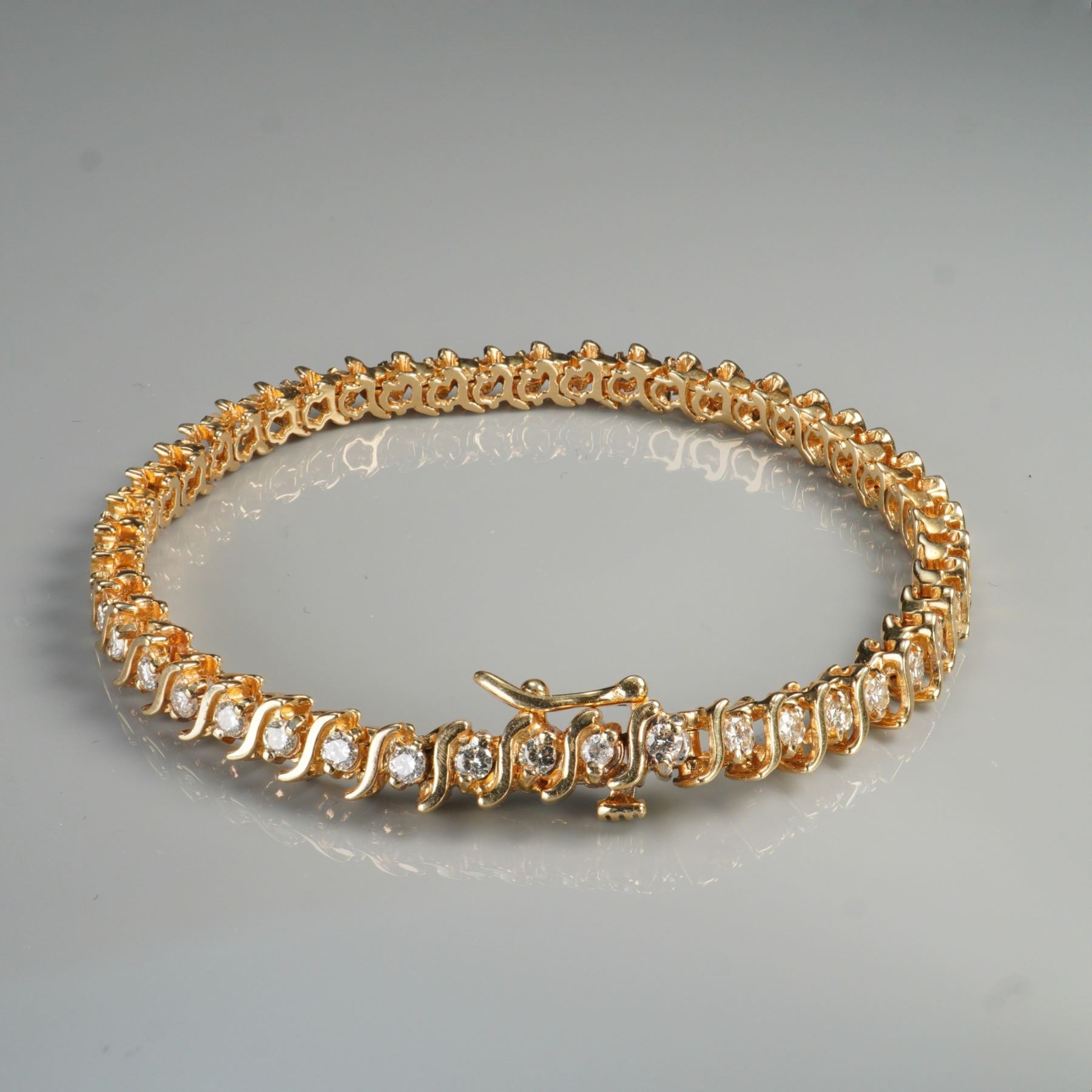 A beautifully crafted 14K yellow gold bracelet set with round-cut white diamonds totaling approximately 1.25 carats. Each diamond is prong-set within a graceful S-link design, creating fluid movement and continuous sparkle across the wrist. The bracelet features a secure box clasp with safety latch and is marked 14K. A timeless and refined piece that adds sophistication to any collection. Weight: 13.8g.