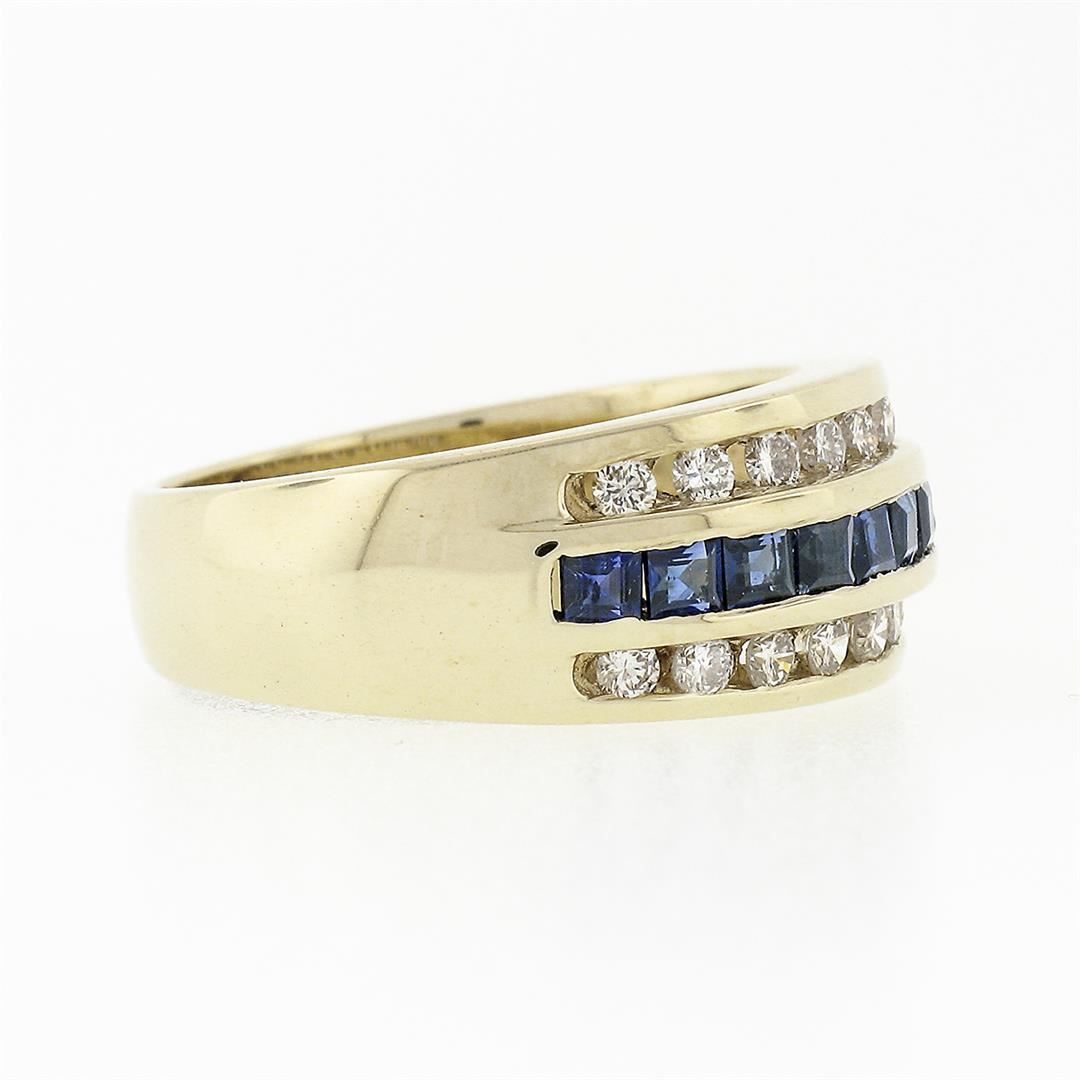An estate solid 14k yellow gold wide band ring, with 11 square step cut natural sapphires (0.77ctw ), and 20 round brilliant cut natural diamonds (G/H - VS1/VS2 ; 0.60ctw). The ring is size 7.5, weighs a total of 7.30 grams, and measures 8.8mm wide.