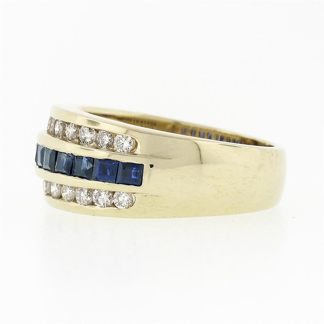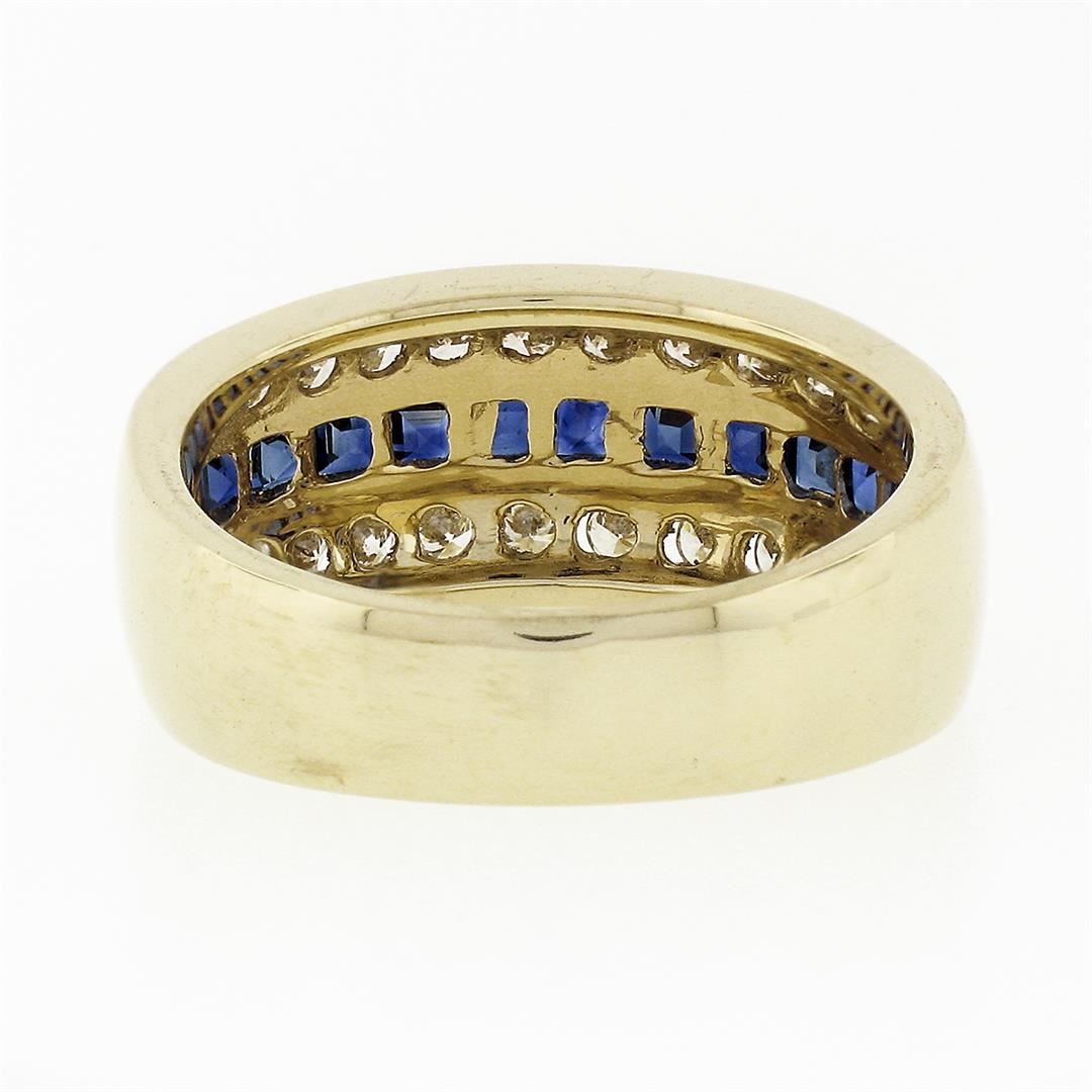 An estate solid 14k yellow gold wide band ring, with 11 square step cut natural sapphires (0.77ctw ), and 20 round brilliant cut natural diamonds (G/H - VS1/VS2 ; 0.60ctw). The ring is size 7.5, weighs a total of 7.30 grams, and measures 8.8mm wide.