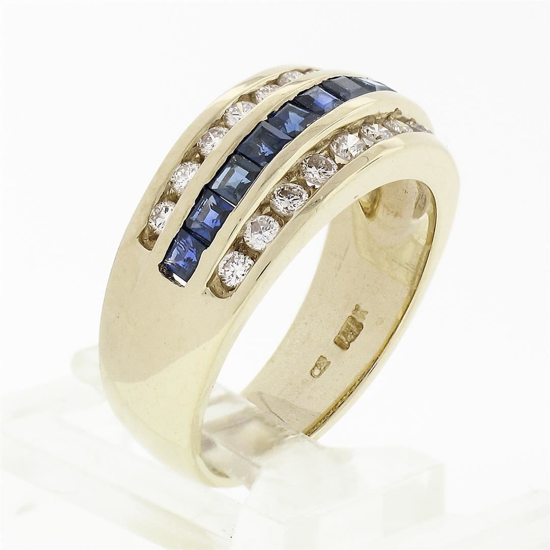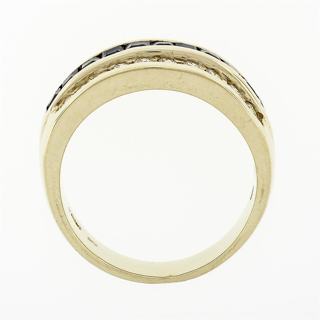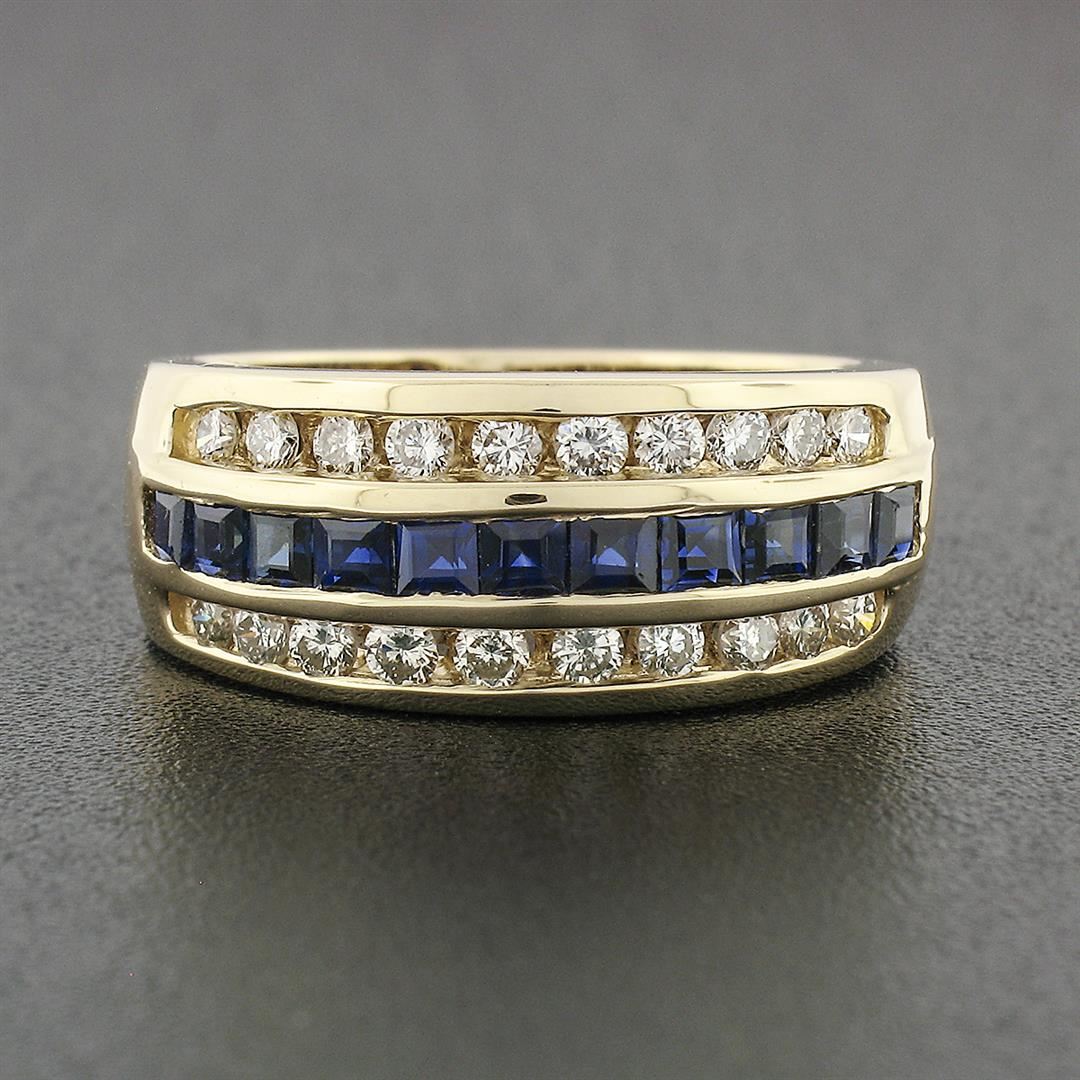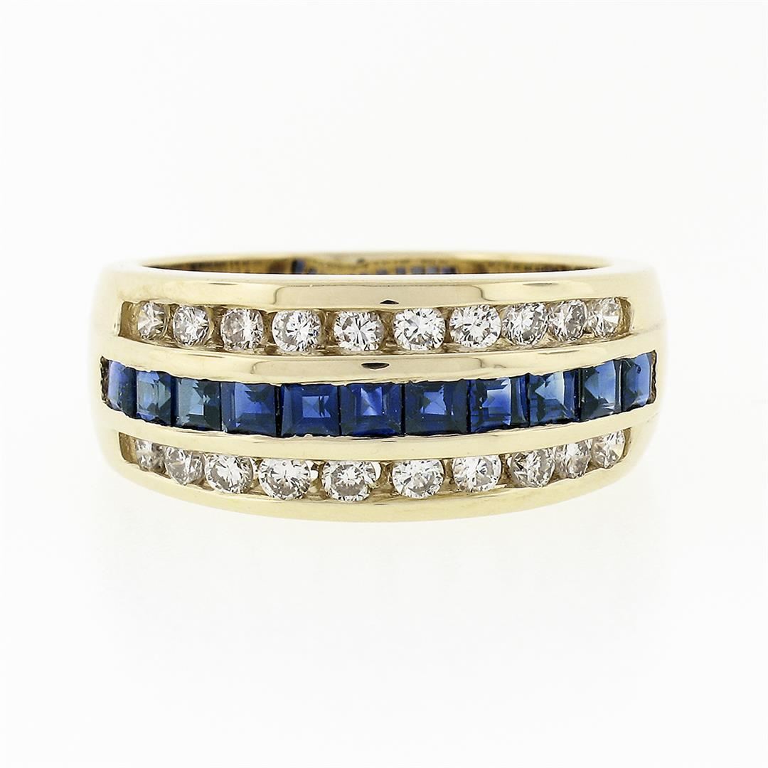 An estate solid 14k yellow gold wide band ring, with 11 square step cut natural sapphires (0.77ctw ), and 20 round brilliant cut natural diamonds (G/H - VS1/VS2 ; 0.60ctw). The ring is size 7.5, weighs a total of 7.30 grams, and measures 8.8mm wide.